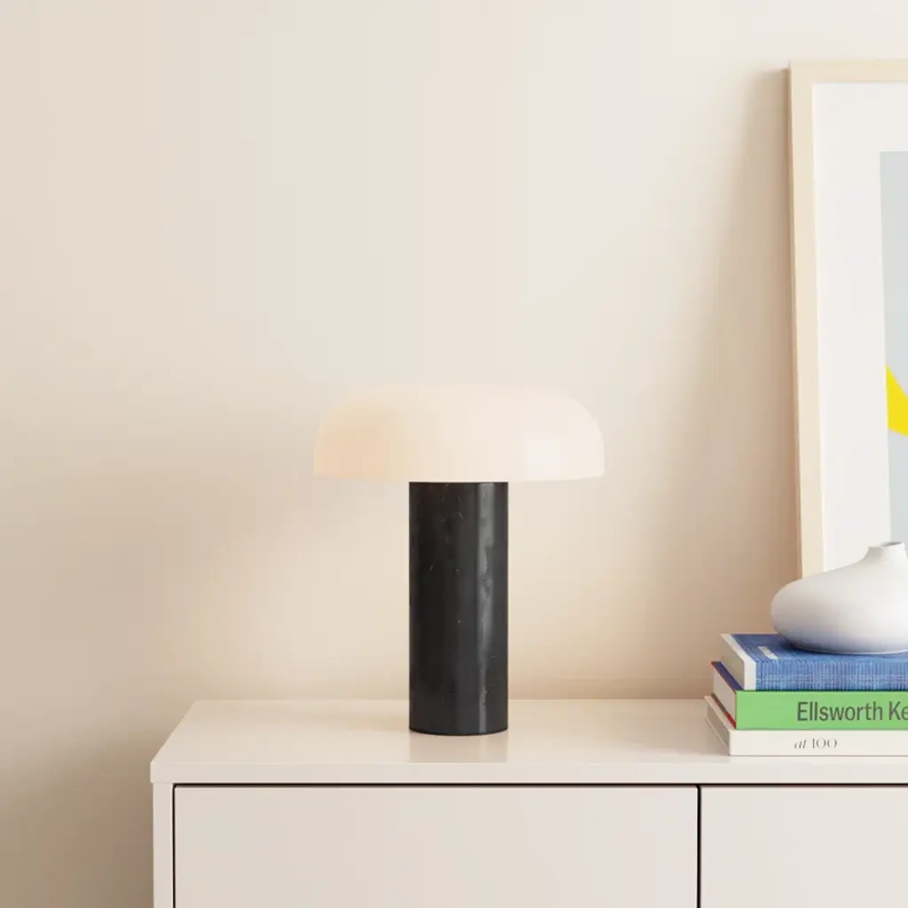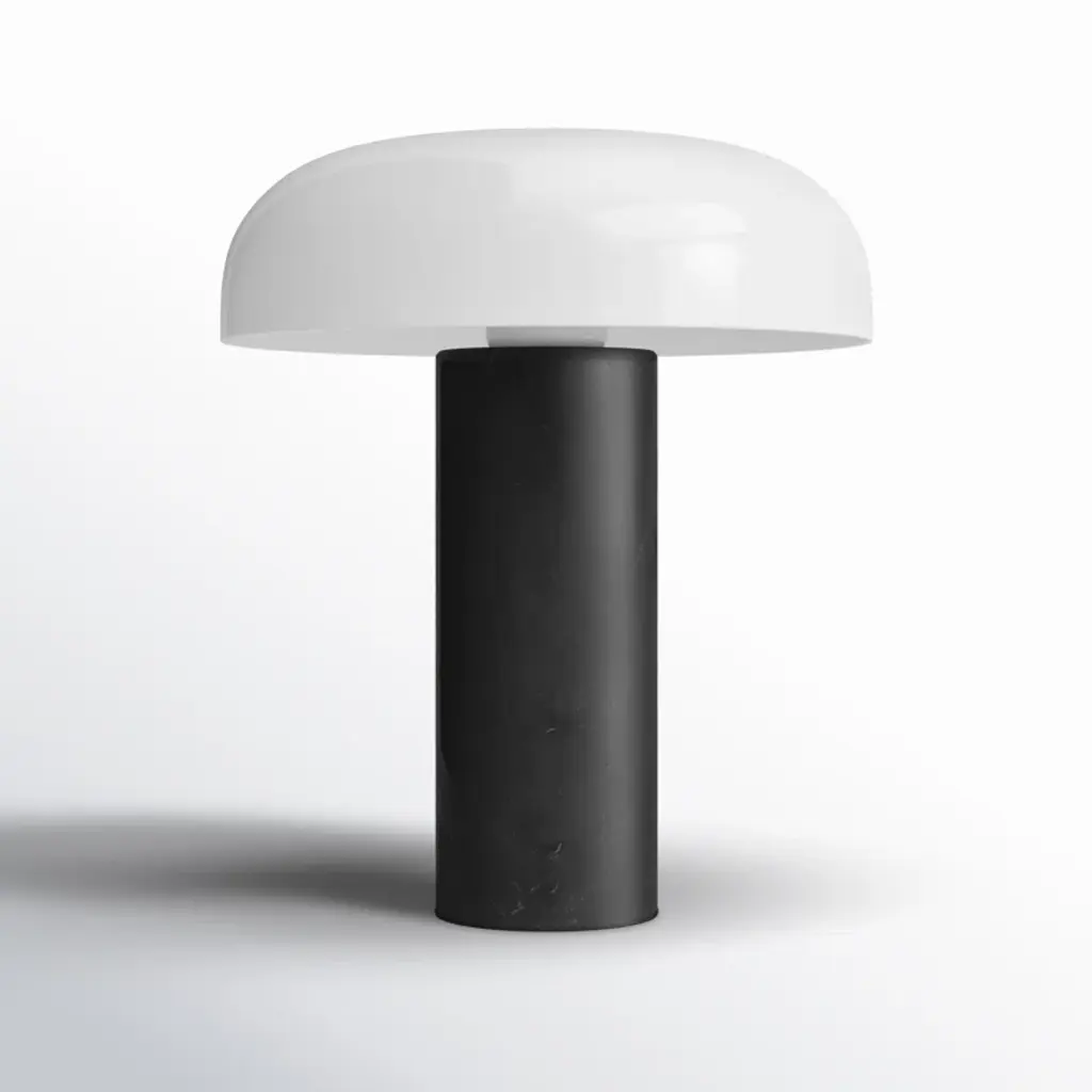 Step up your decor with the chic and charming presence of our Damiano table lamp. It updates a mid-century-inspired lamp with ultimate grace and poise. A beautifully streamlined dome shade is complemented with a cylindrical base. The white shade creates a polished contrast with the black marble base. Its glass shade spreads light to cast a soft and pleasant glow. Offering sophisticated drama, our table lamp makes a perfect statement as a pair flanking your bed, sofa, or console table.