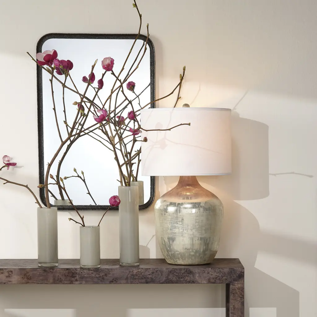 The metallic elegance of the Damsel Table Lamp cannot be overlooked. Its metallic glass texture gives it a luxurious, multifaceted appearance. This oversized statement piece has a voluptuous silhouette with a lightweight and shimmery texture.