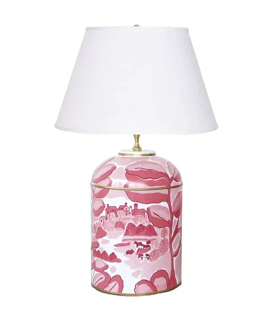 The Bristow lamp by Dana Gibson features a quaint, countryside scene hand painted in rich detail. Topped with a beautiful white linen shade, this beautiful lamp will steal the show in any room. Available in blue, green, or pink.