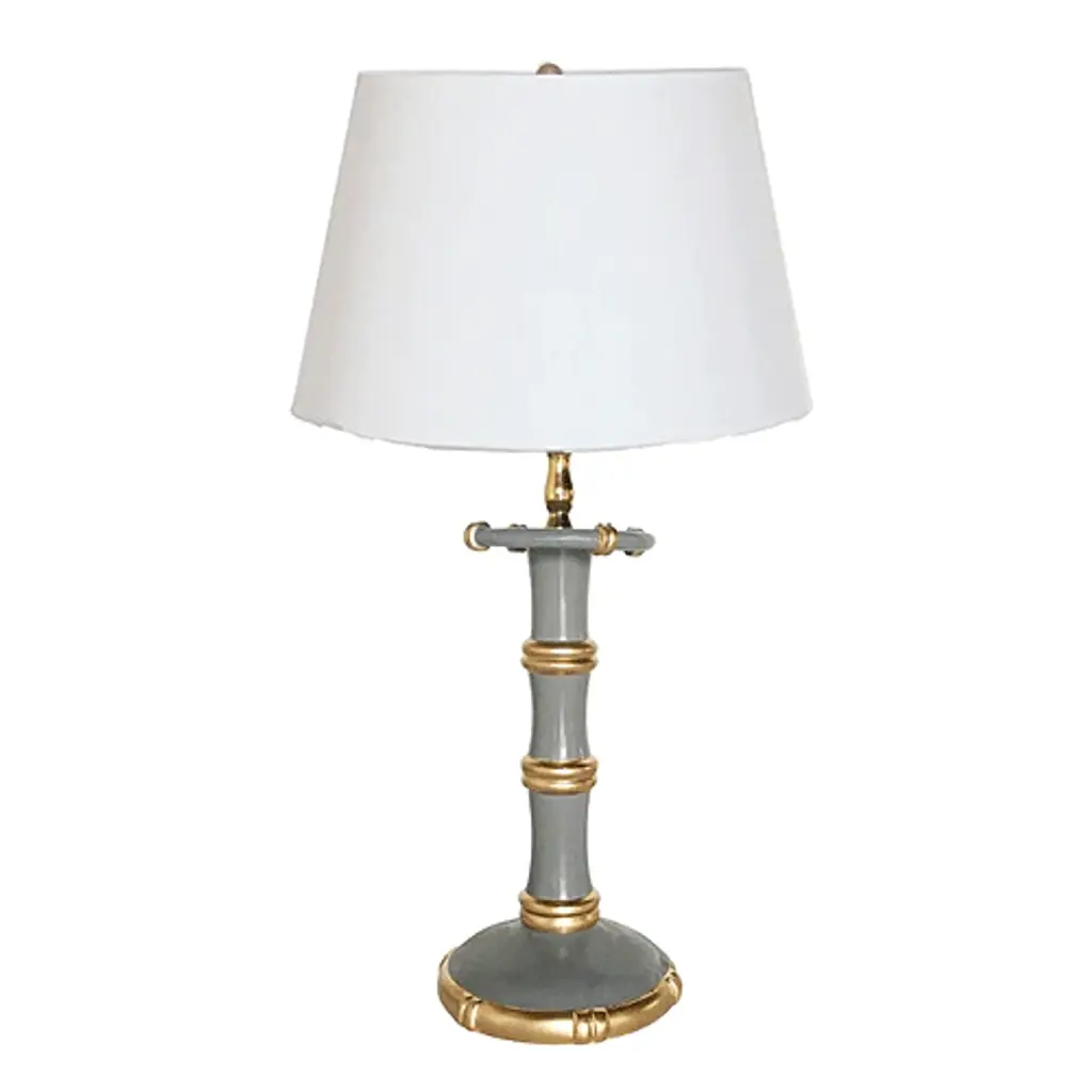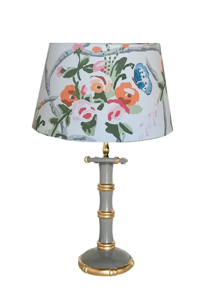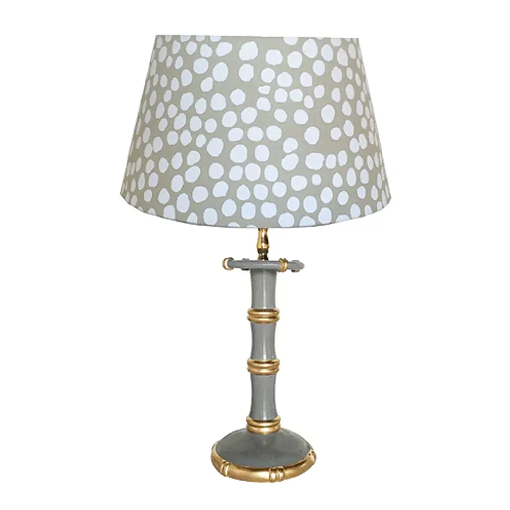 This beautiful grey candle stick lamp by Dana Gibson is hand painted in rich detail and topped with a beautiful white linen, chintz, or thumb print shade. This colorful, decorative lamp is an easy way to change up your decor and upgrade your space!