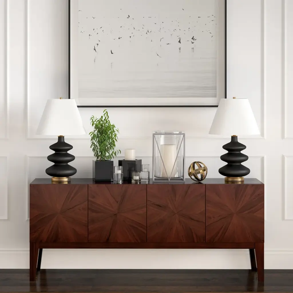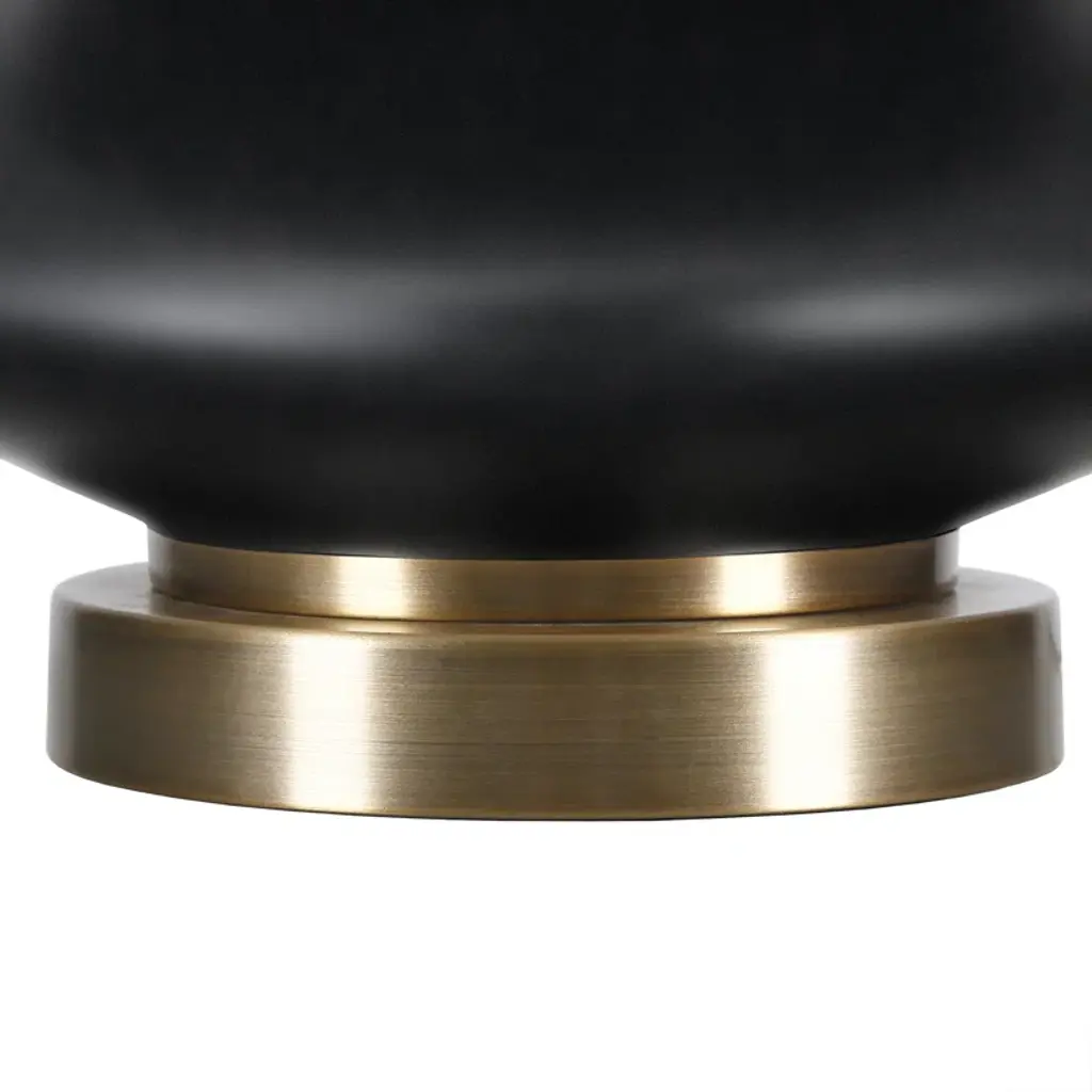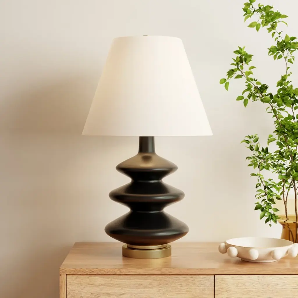 This contemporary table lamp features a triple gourd base made of glass. The body is finished with a matte exterior and is topped off finish a linen empire shade that complements the soft curves featured in the design.