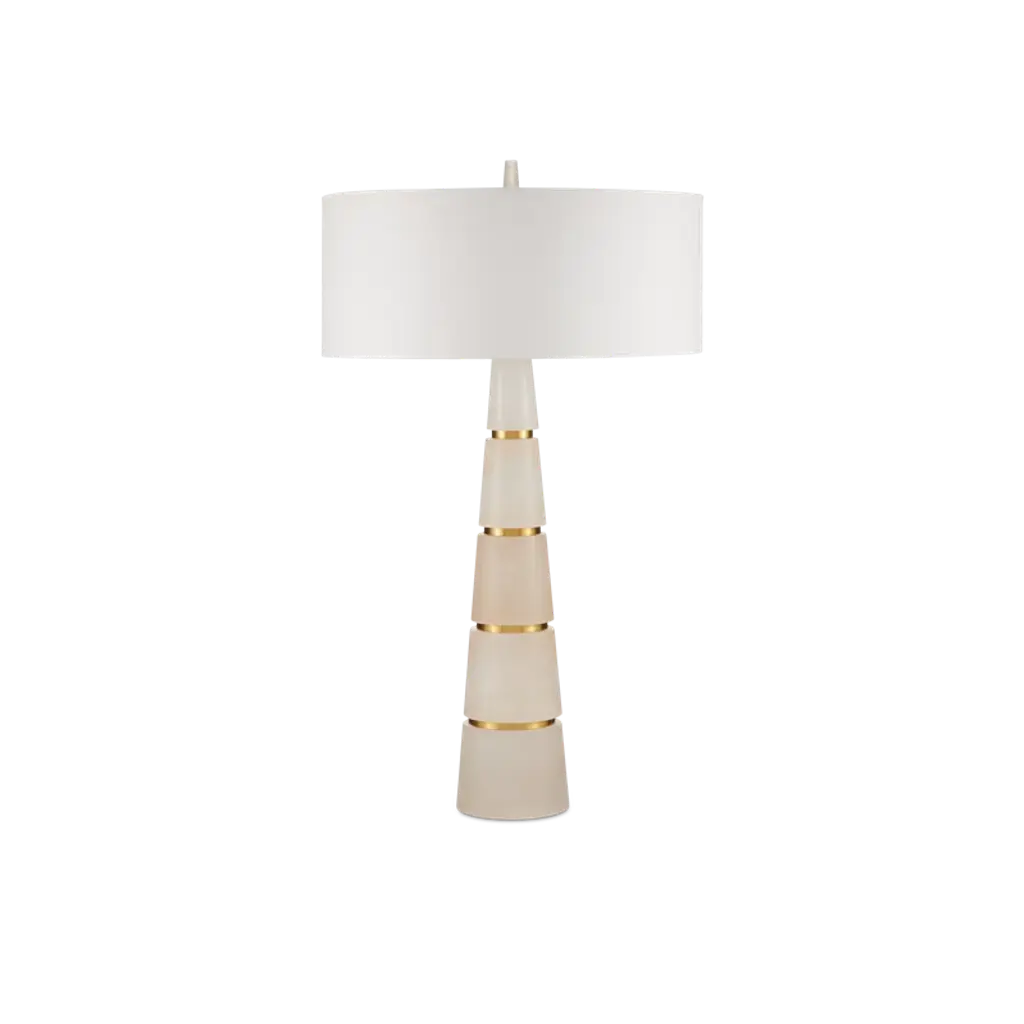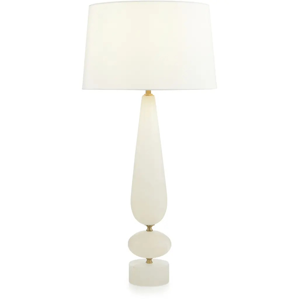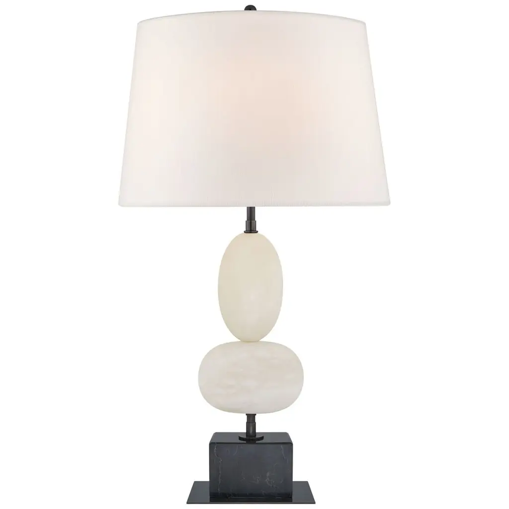 The Dani Table Lamp by Visual Comfort Signature, formerly known as Visual Comfort, gives your home a fashionable appearance. An ultra-thin baseplate provides the foundation for a raised block of brass. This block serves as a platform for a slim metal rod that is beautifully enveloped by ascending ovular fixings of refined alabaster. The smooth shapes displayed throughout this lamp’s composition highlight the meticulous craft that goes into the Dani Table Lamp’s contemporary design. A halogen bulb readily lights up your 21st-century master suite or living room with ease.