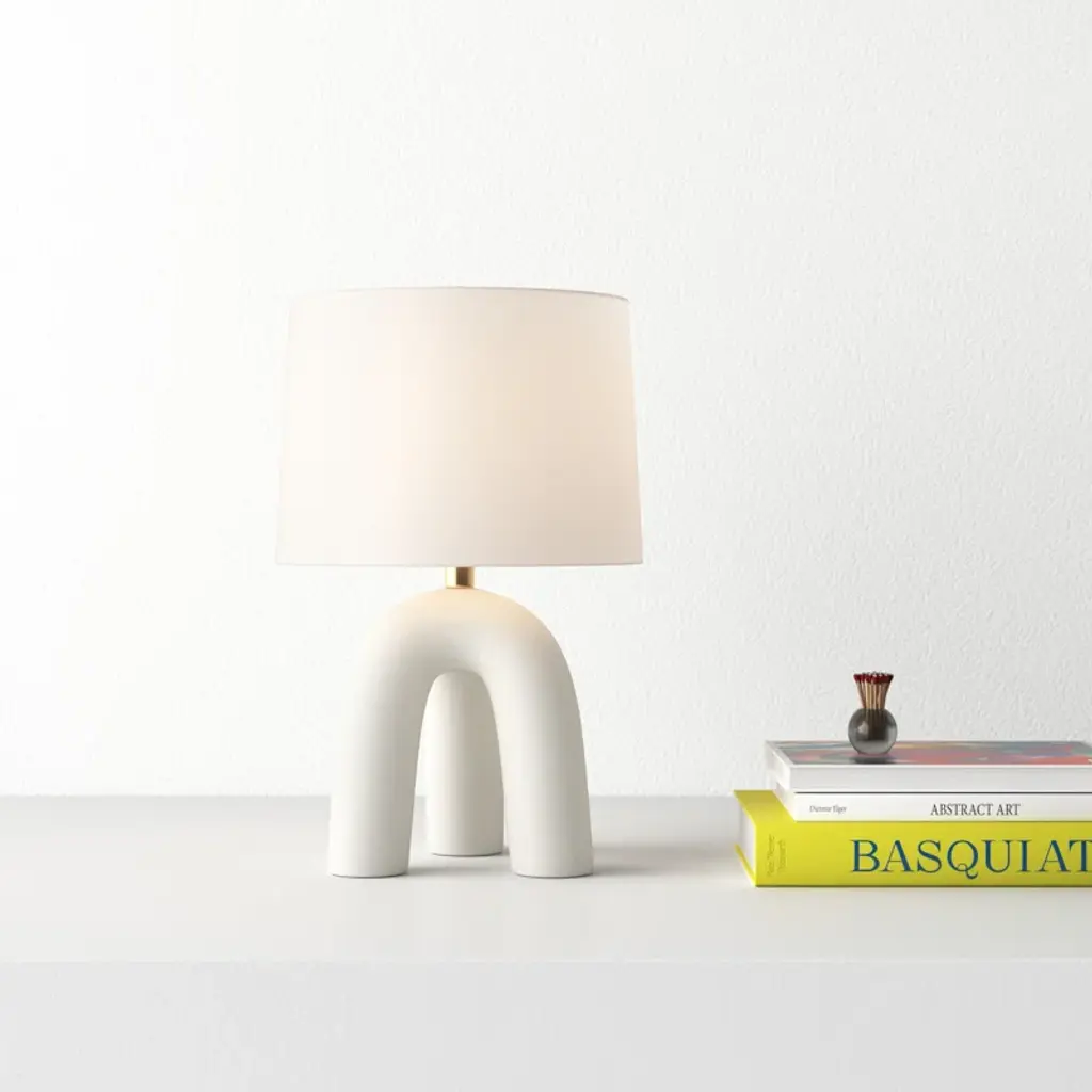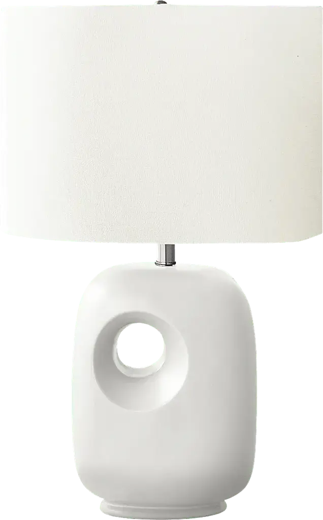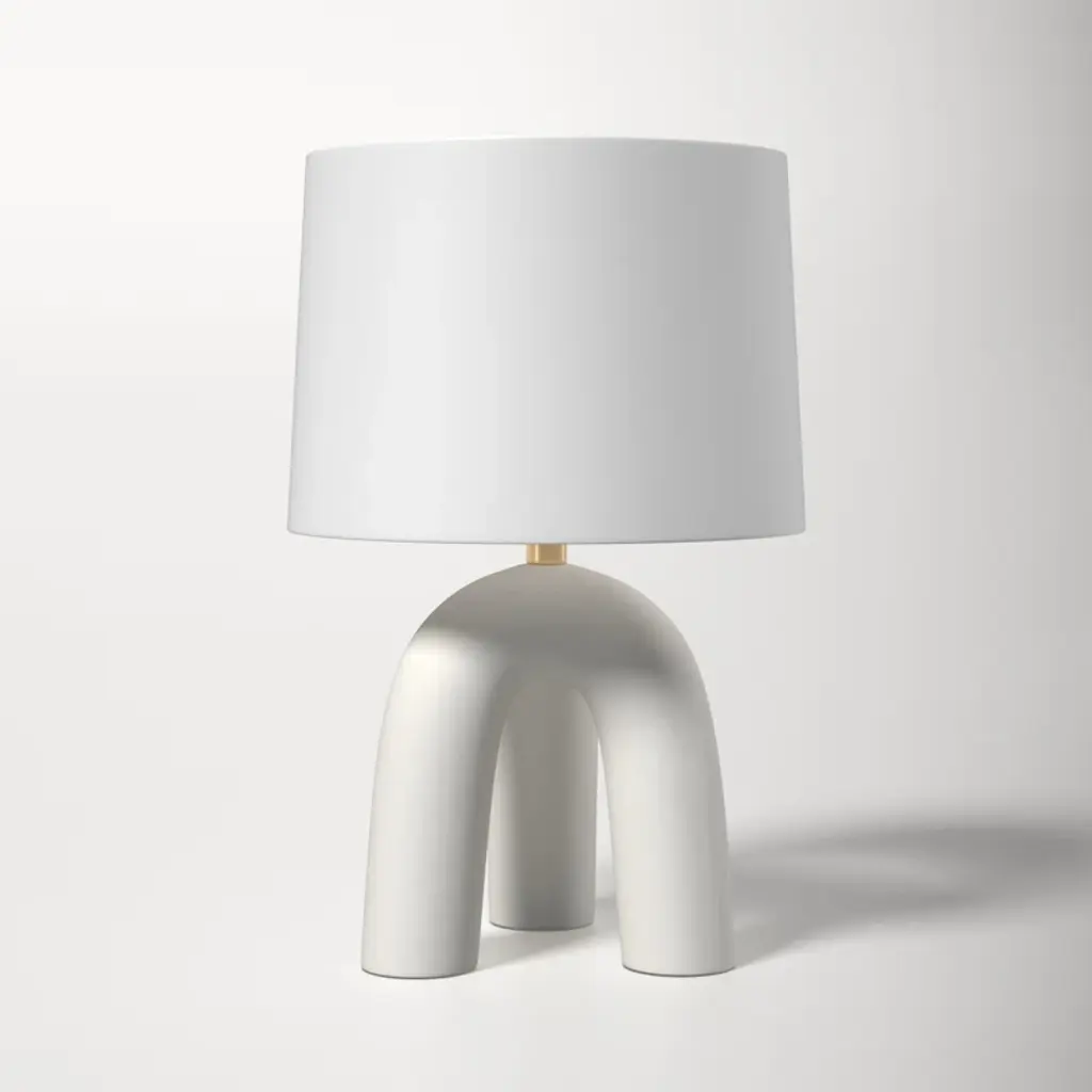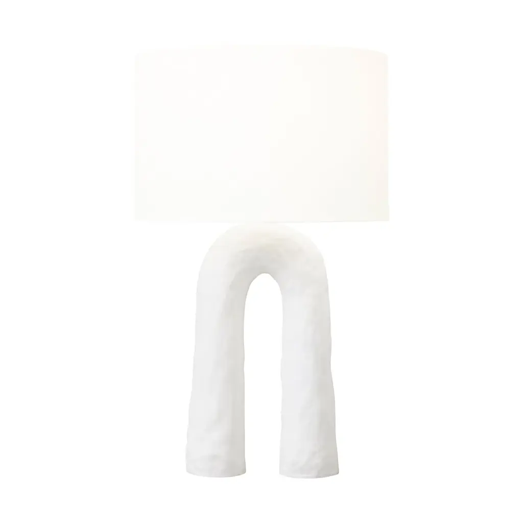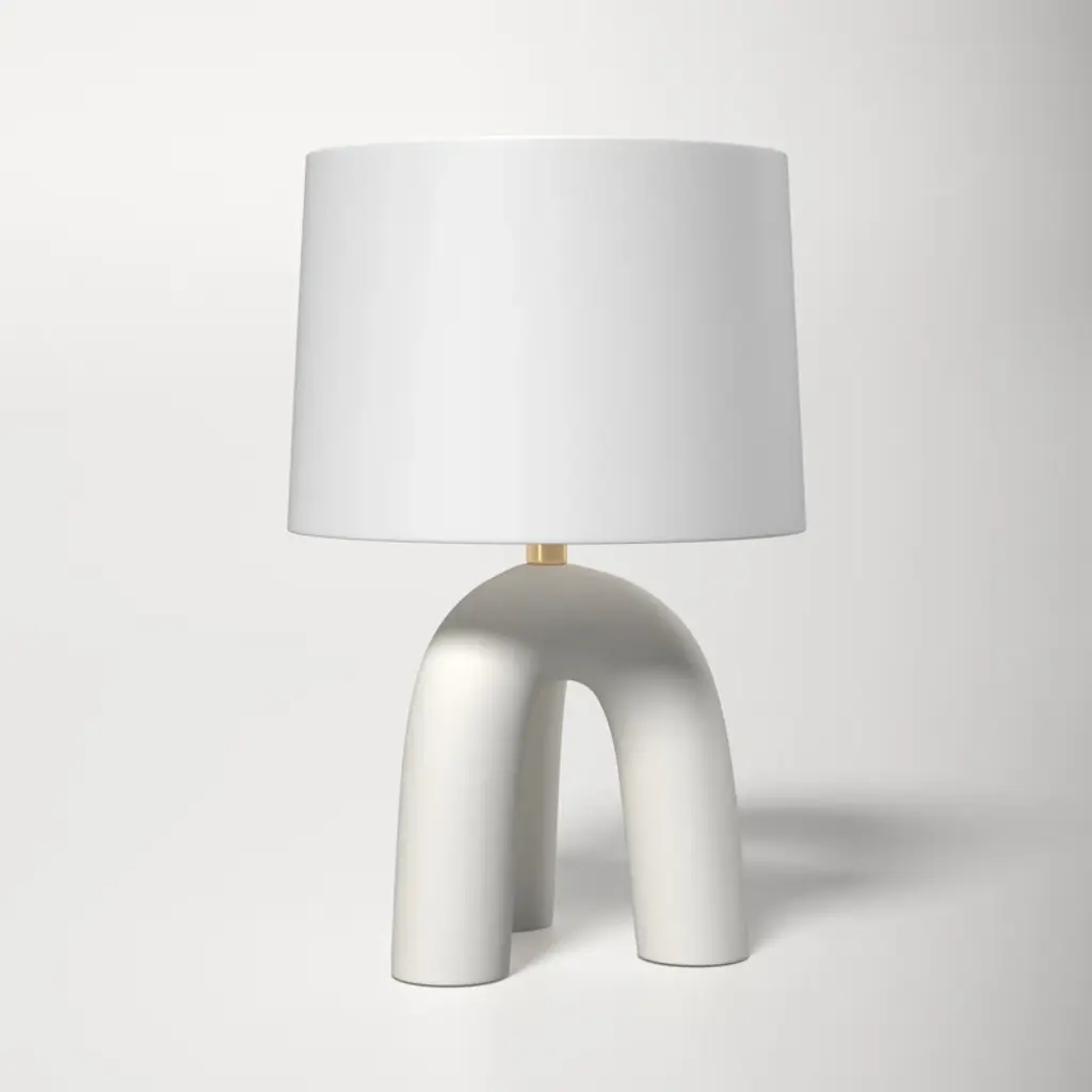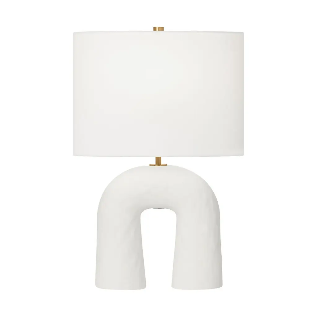 Charming and fun, Danielle Pond reminds us not to take things so seriously. Three oversized tubular shapes form the tripod-like base of this delightful table lamp. A white linen shade in a similar size and shape to the base provides a soft light and a sense of balance. The aged brass finish paired with the satin ivory base adds just the right amount of subtle sophistication.