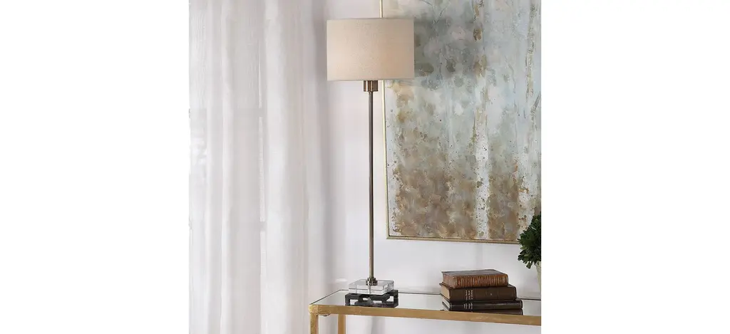 This simple, contemporary table lamp features clean lines and a versatile style. The iron base is finished in a plated antique brass, displayed on a thick crystal block and a cast iron foot. The round hardback drum shade is a beige linen fabric with light slubbing.