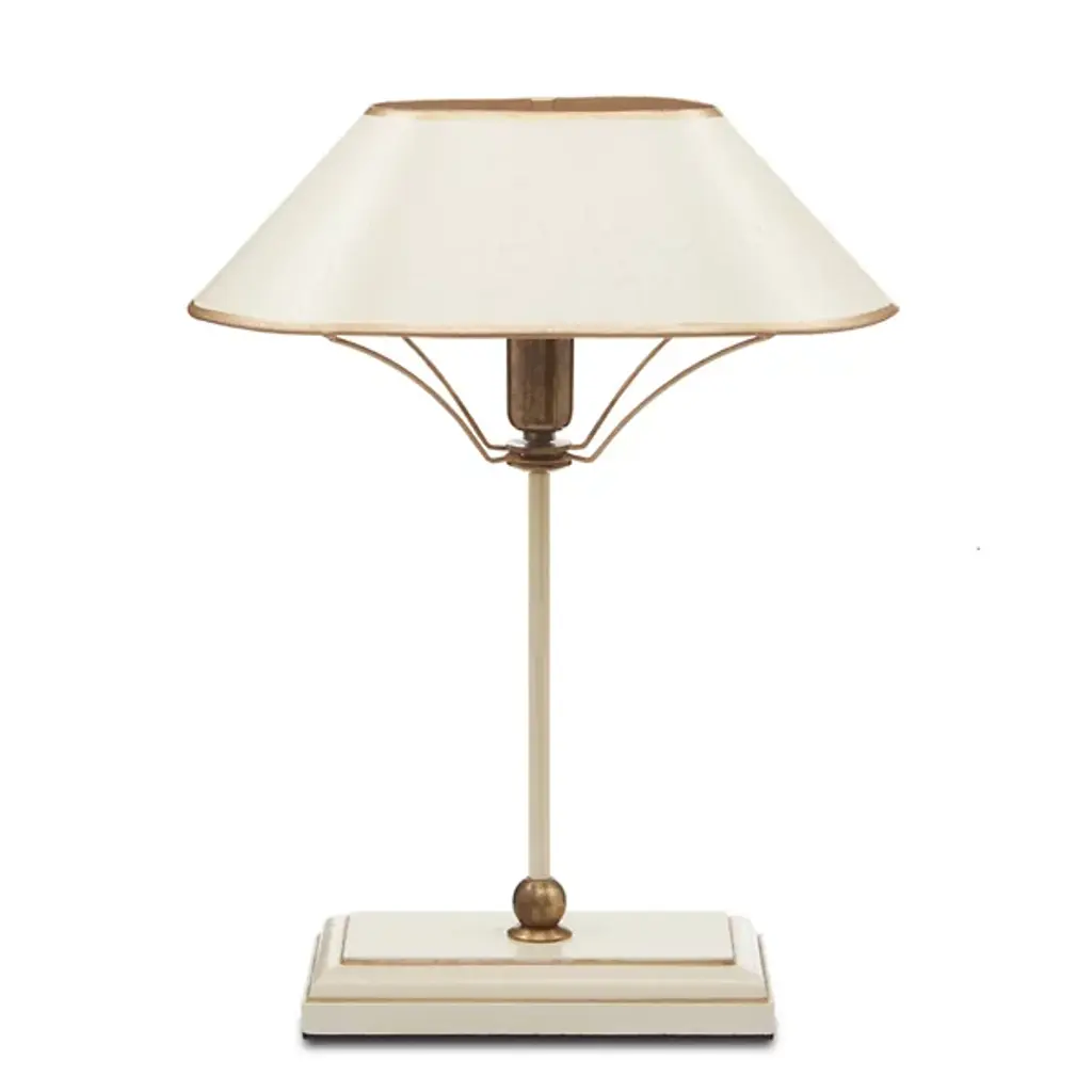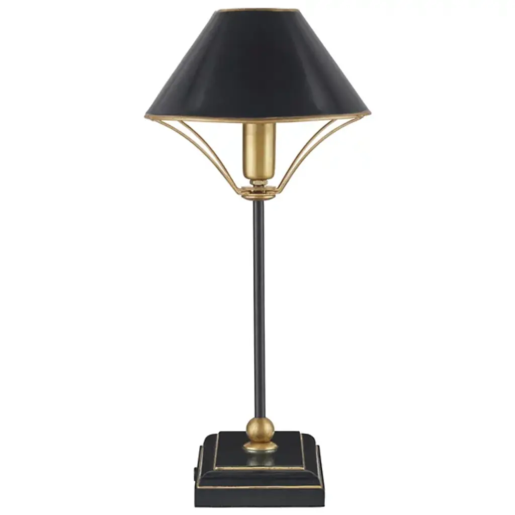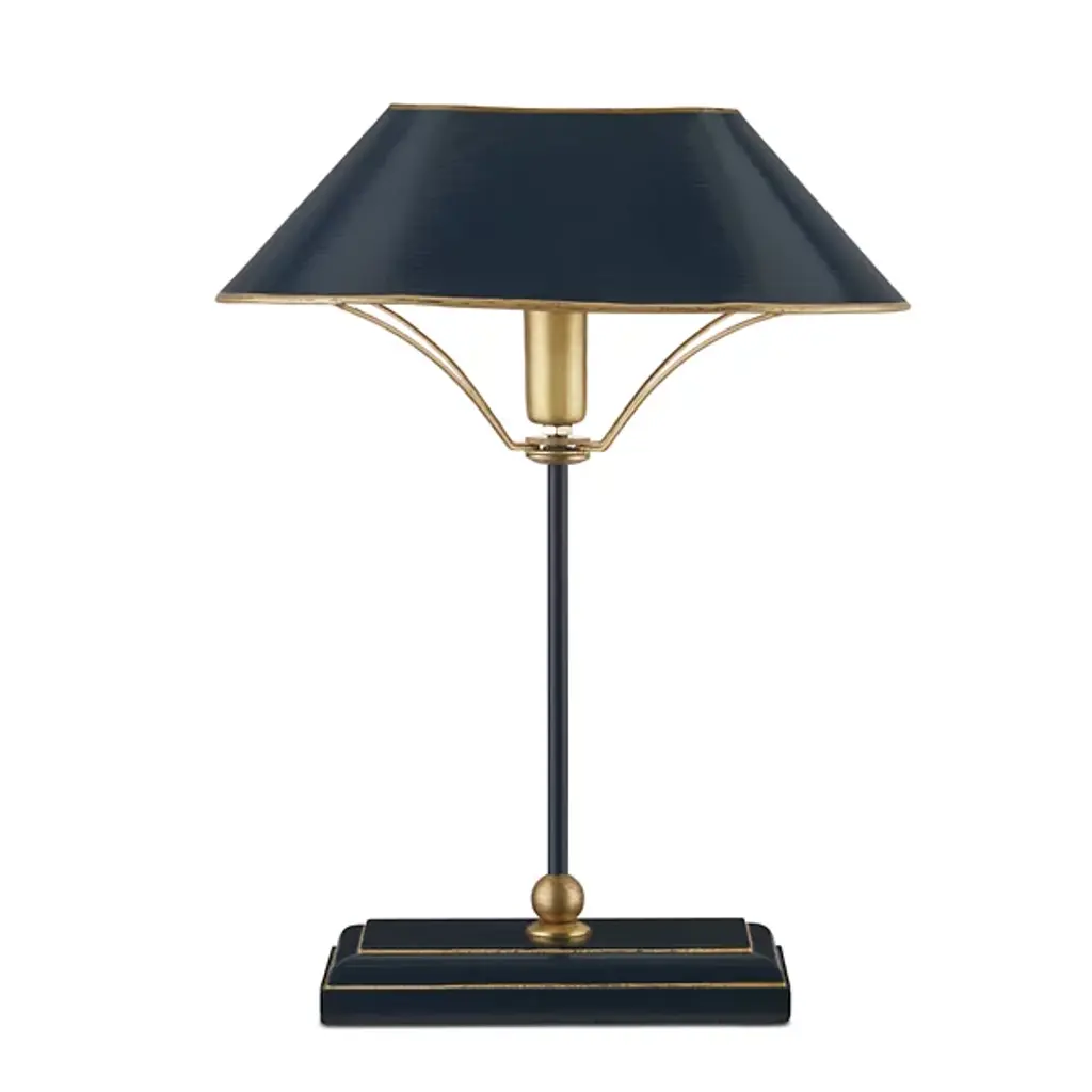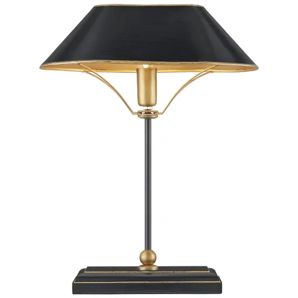 Add a distinct, modern piece to the smaller surfaces of your home with the Daphne Table Lamp from Currey & Company. A rectangular base with brass accents starts the piece, upholding a long and thin body that leads to a sharply angled shade. Thin arms below the shade balance the silhouette while providing additional accents. The single bulb under the shade brings it to life with a warm and even glow.