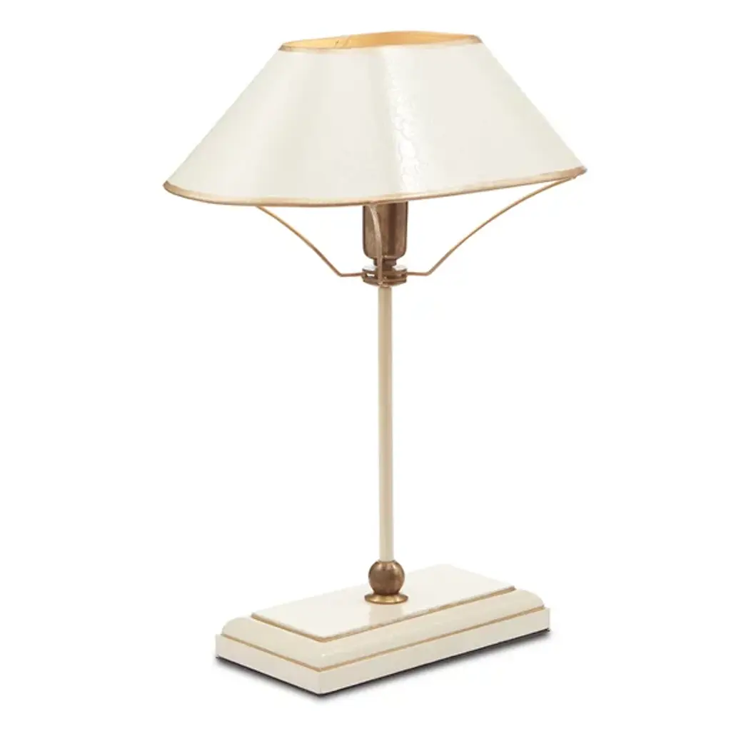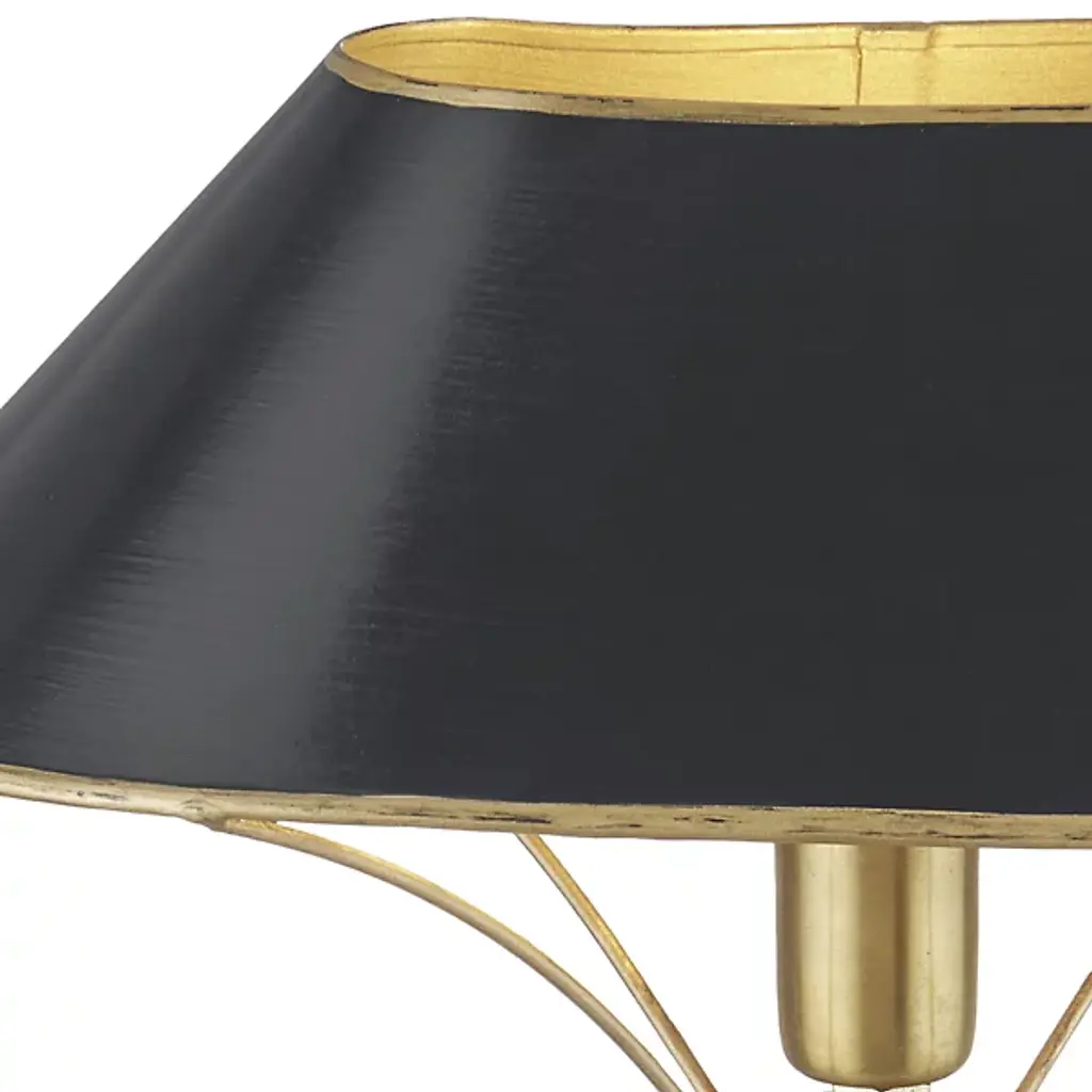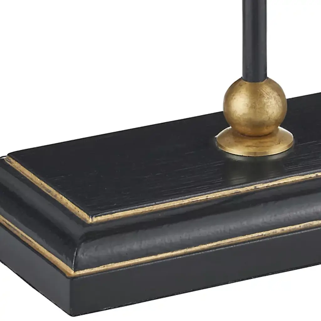 Add a distinct, modern piece to the smaller surfaces of your home with the Daphne Table Lamp from Currey & Company. A rectangular base with brass accents starts the piece, upholding a long and thin body that leads to a sharply angled shade. Thin arms below the shade balance the silhouette while providing additional accents. The single bulb under the shade brings it to life with a warm and even glow.