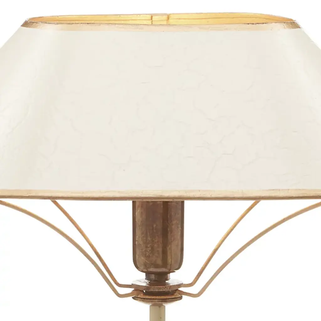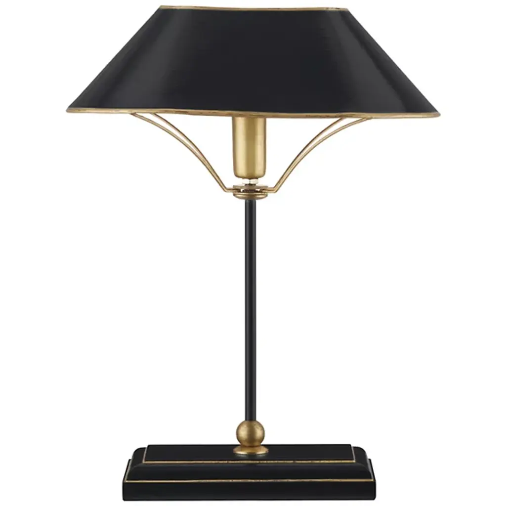 Add a distinct, modern piece to the smaller surfaces of your home with the Daphne Table Lamp from Currey & Company. A rectangular base with brass accents starts the piece, upholding a long and thin body that leads to a sharply angled shade. Thin arms below the shade balance the silhouette while providing additional accents. The single bulb under the shade brings it to life with a warm and even glow.
