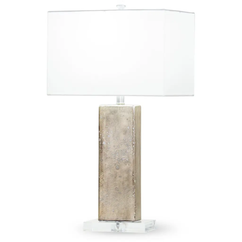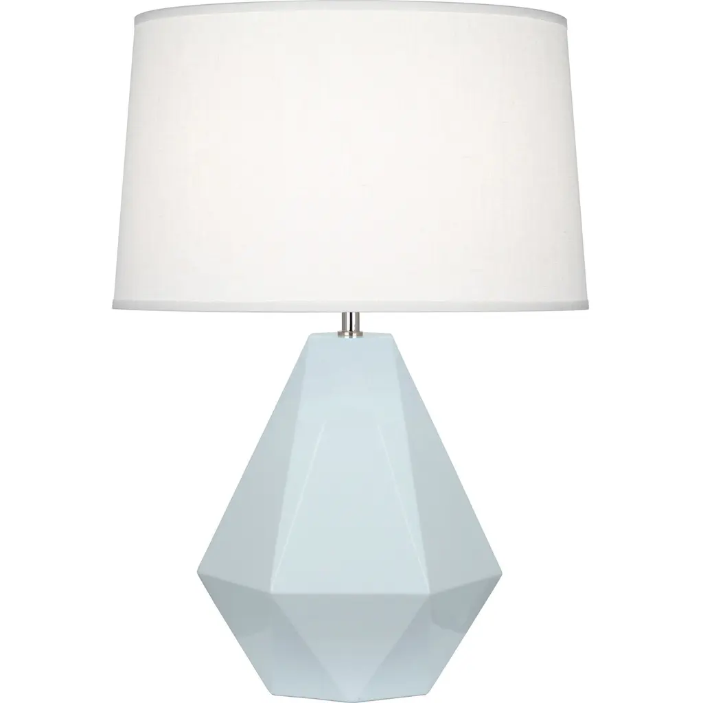 Modern and eye catching, this chic table lamp features an elegant light marble base atop a crystal pedestal. Created with a special glaze process that creates a soft marble-like effect on the faceted ceramic shape, this piece is a modern interpretation of a neoclassical inspiration. The white fabric shade diffuses soft light into any living space, in contrast to the geometric edges of the lower design.