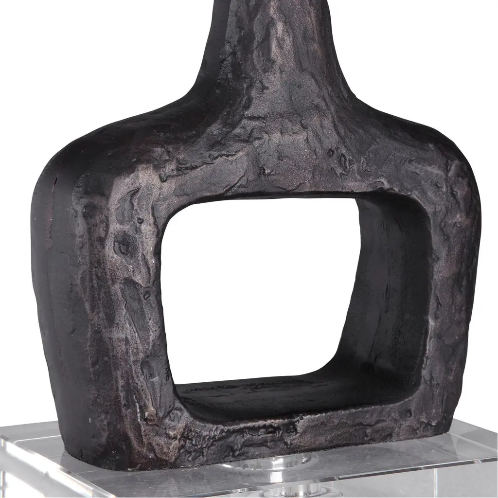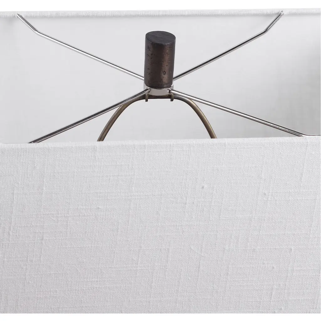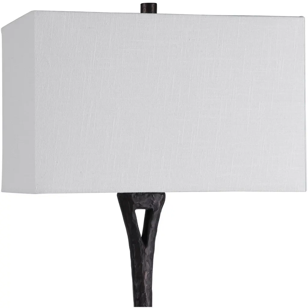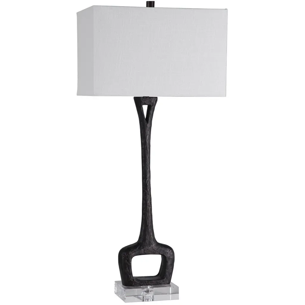 This Cast Iron Table Lamp Is Finished In A Masculine Aged Black With A Heavy Organic Texture Displayed On An Elegant Crystal Foot. The Lamp Is Paired With A Rectangular Hardback Shade In A White Linen Fabric With Vertical Slubbing.