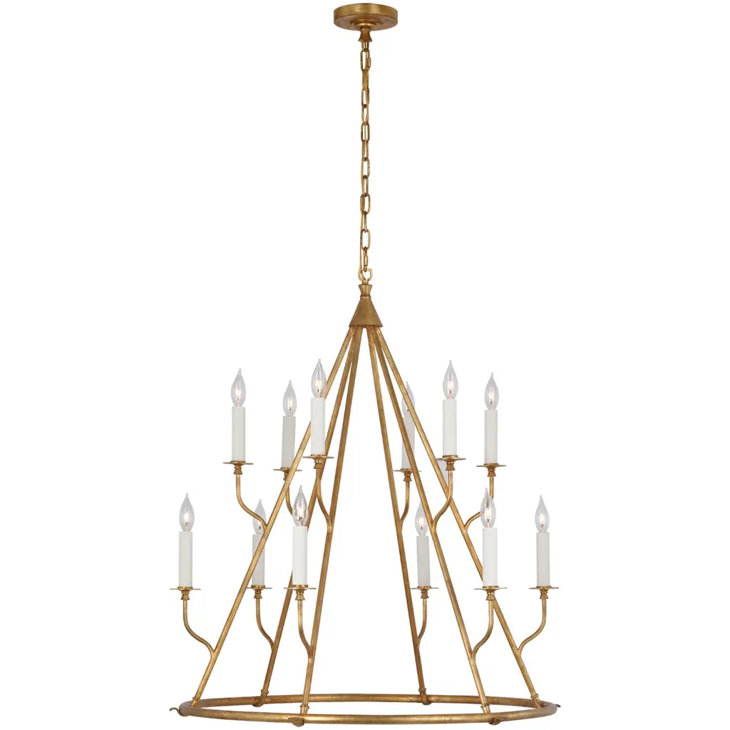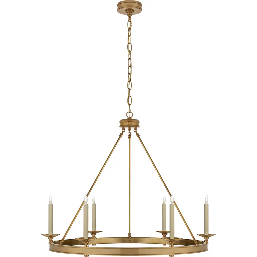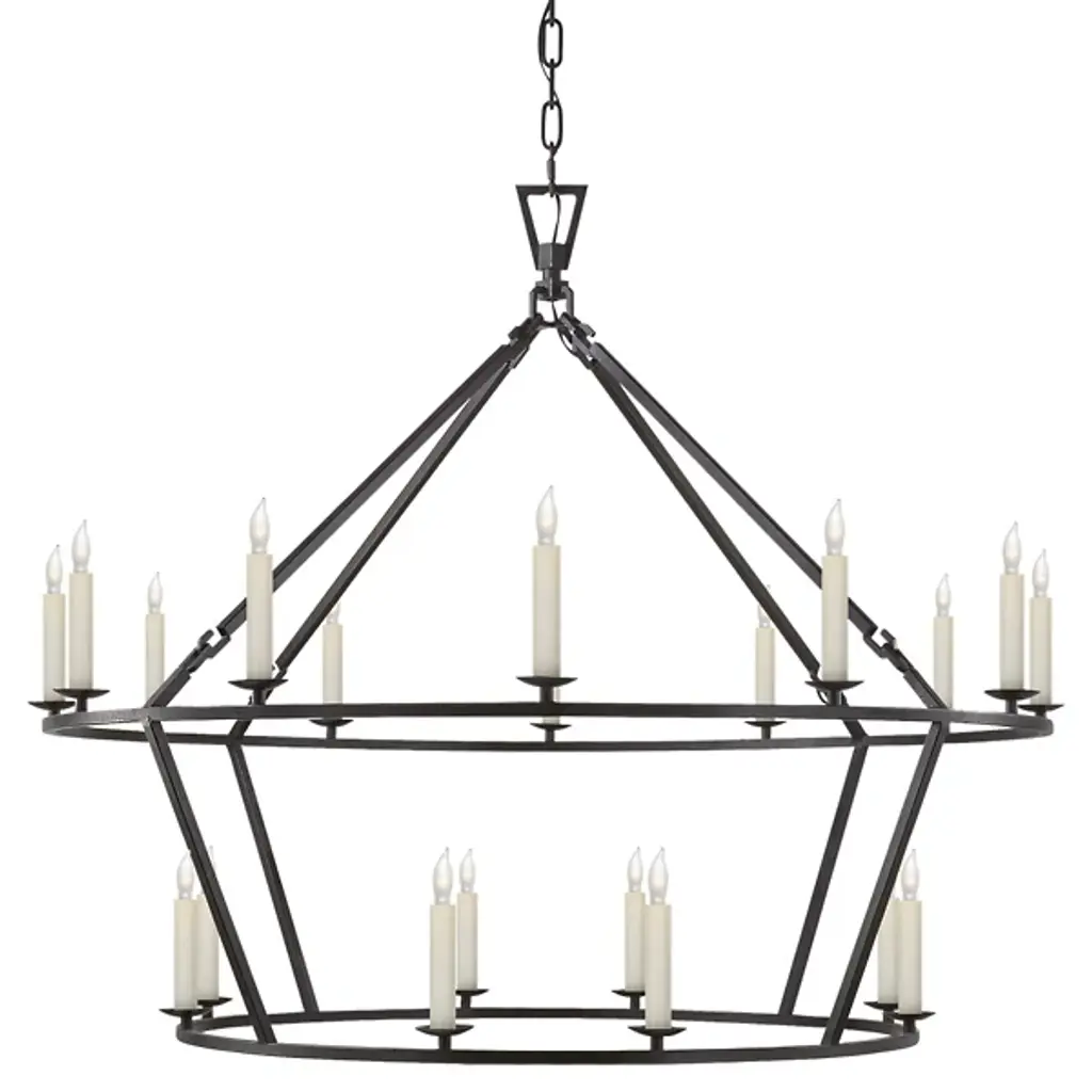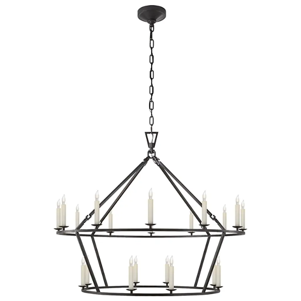 Express a lasting eloquence with the open lines and broad reach of the Darlana Large Two-Tiered Ring Chandelier from Visual Comfort Signature, formerly known as Visual Comfort, This open fixture offers a smooth spin on transitional design; it offers elegant illumination to large spaces, relying on a chain suspended from a circular metal canopy to retain two layers of illumination. A large upper ring and a smaller lower ring hold the fixture’s array of evenly-spaced candelabra lamps, while the ring structure itself is held in place by an array of angular linked arms that sweep out from a finial at the base of the chain.