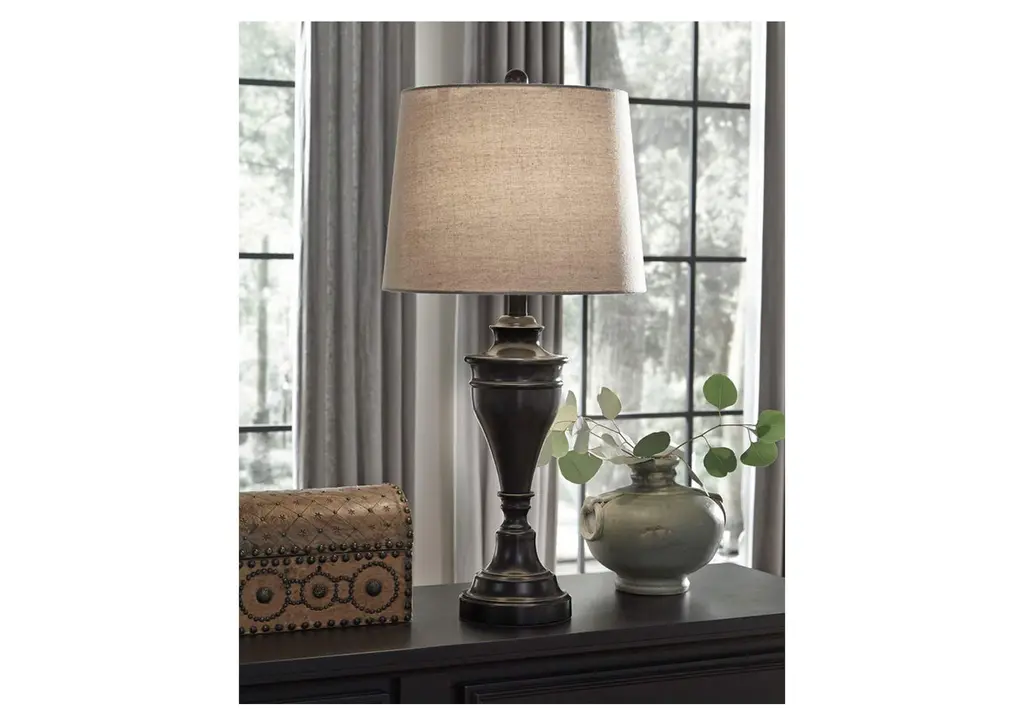 A delightfully turned pedestal base gives the Darlita table lamp a sense of easy elegance. Its dark bronze-tone metal is a simply stylish counterpoint. Weight 11.000 lbs. (4.95kgs.)