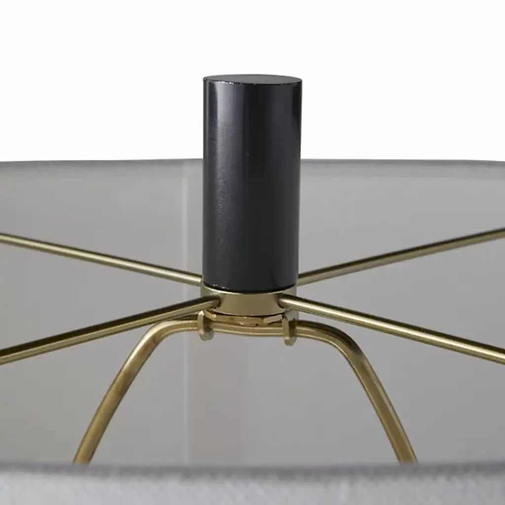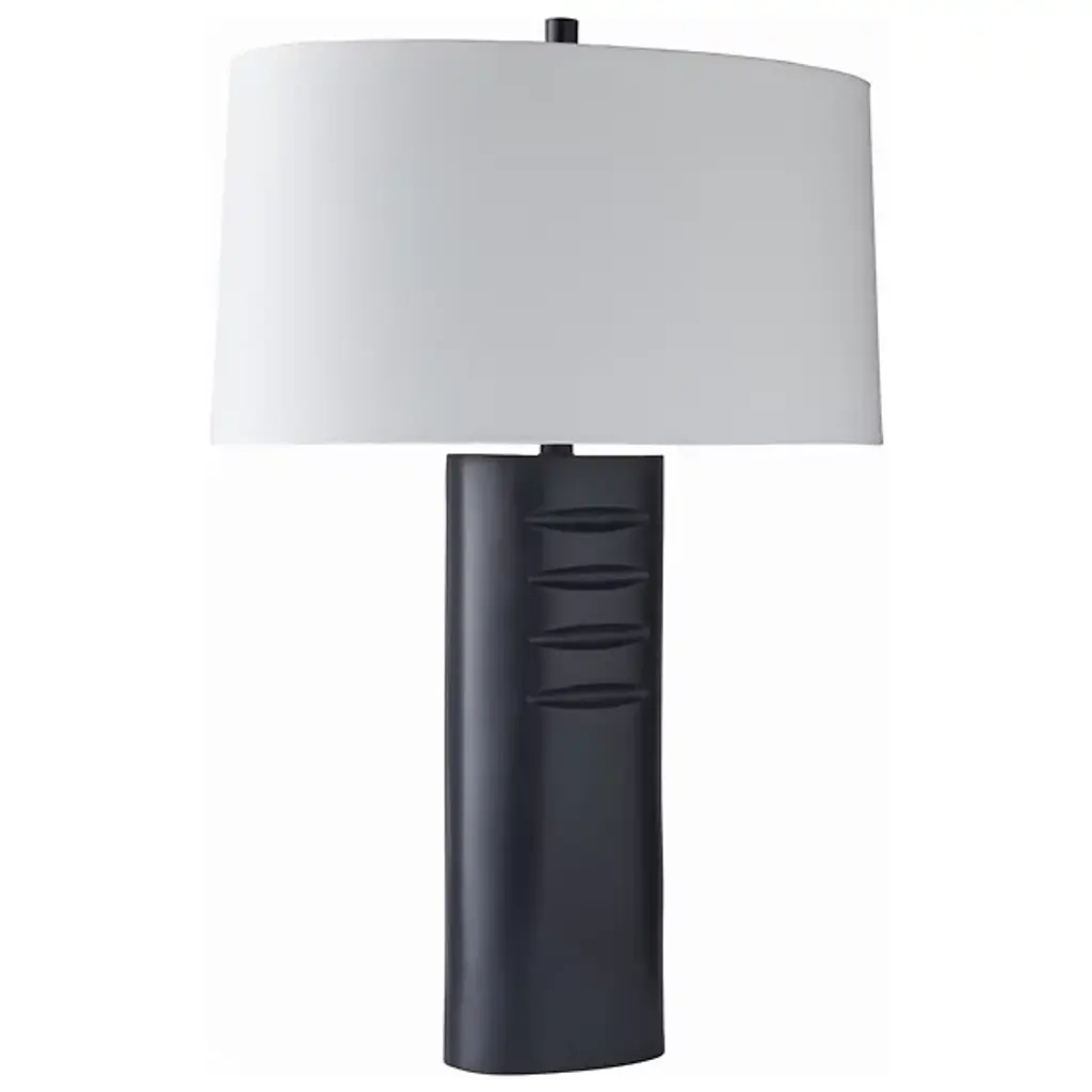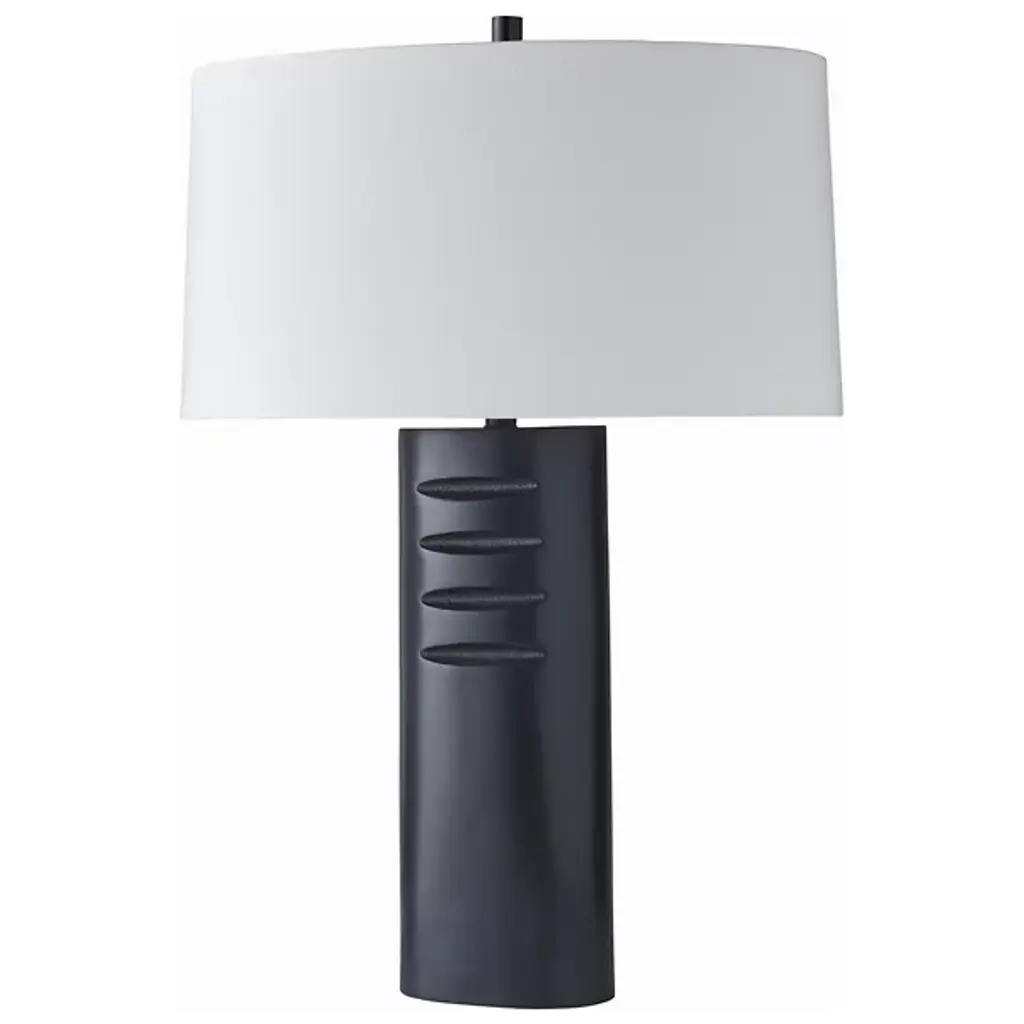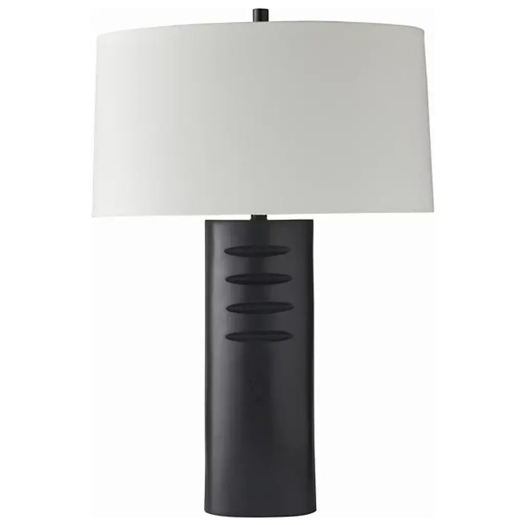 The Darth Table Lamp from Arteriors features etched, four-finger grooves and a bronzed aluminum column that exudes understated elegance and impactful design. It is versatile enough for staging in multiples and adds a minimalist yet sophisticated touch to any living space. Topped with a cylindrical bronze finial and a white linen oval shade, this lamp balances modern aesthetics with timeless appeal. Its sleek silhouette and quality materials make it an ideal choice for enhancing the ambiance of contemporary interiors.