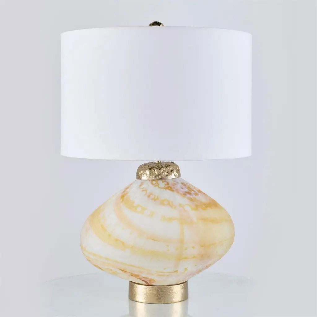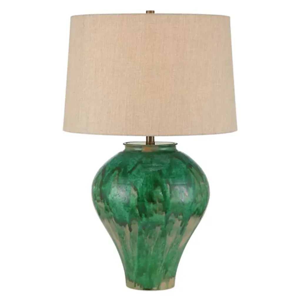 This table lamp's flambé glaze gives it an iridescent shimmer and vibrant colors, making it a work of art and a future heirloom. The lamp sits on a gilded base for added sophistication. Because each lamp is handcrafted, with every lamp's glaze reacting slightly differently in the kiln, no two are exactly alike.