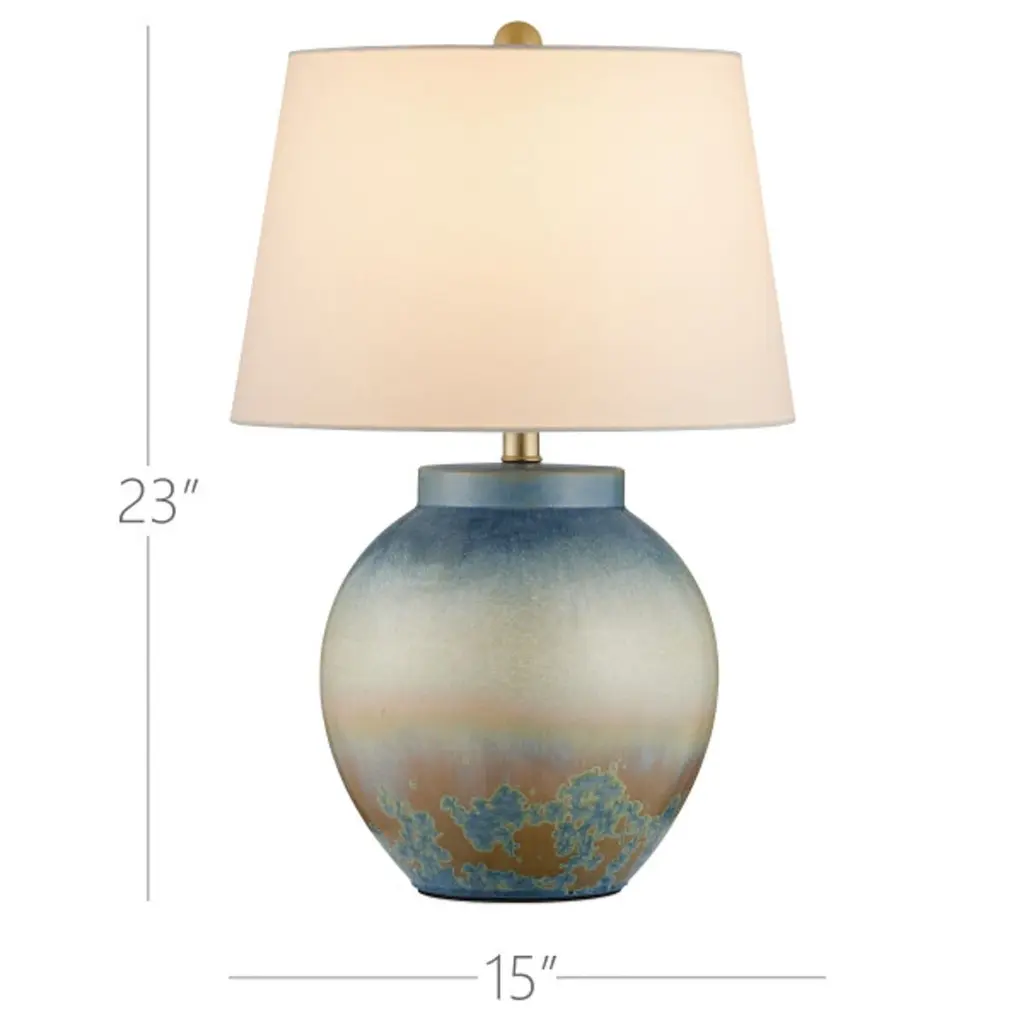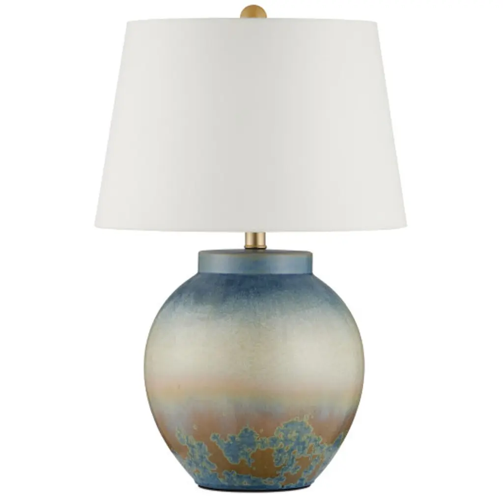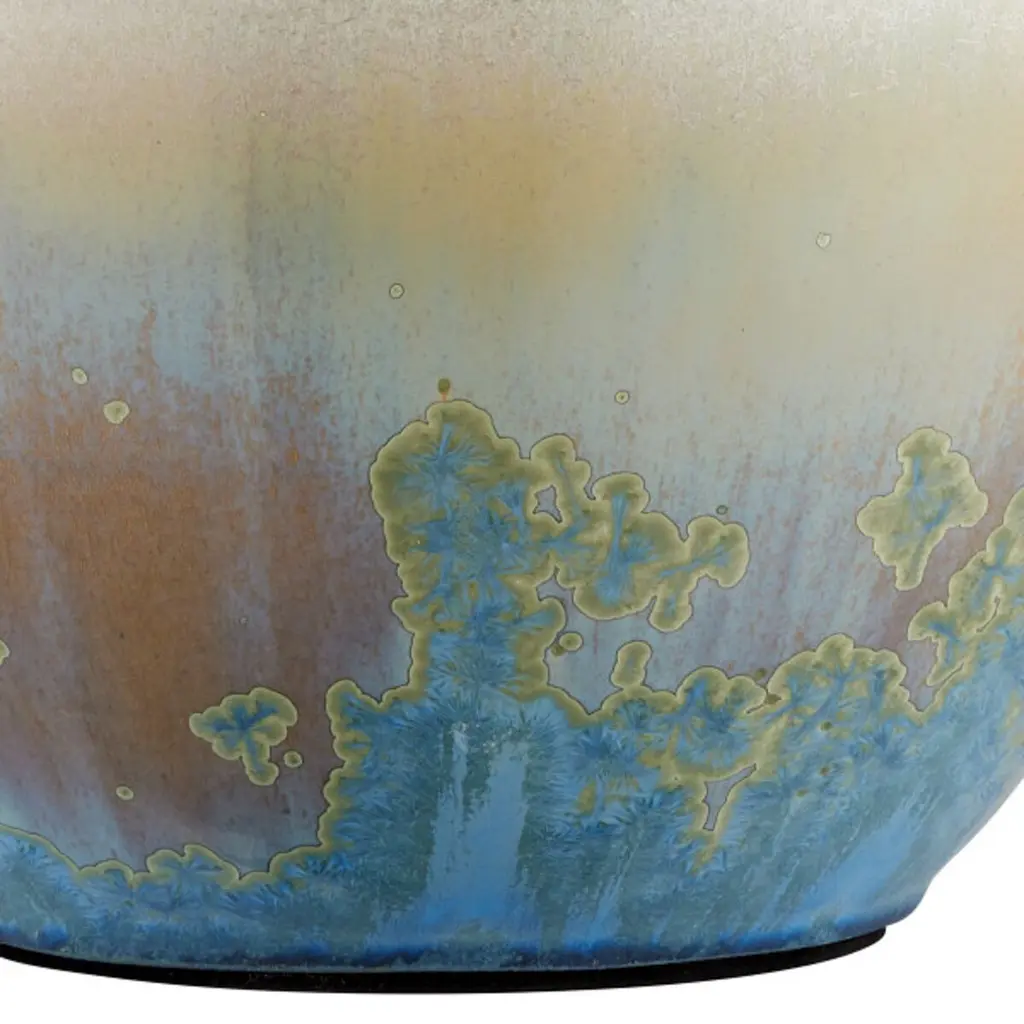 The Dawning Table Lamp features a ceramic body with a uniquely varied surface created through a crystallization process during firing. Multiple layers of different colored glazes react to high kiln temperatures, forming varied surface crystals that flow upward from the base, resulting in one-of-a-kind patterns on every lamp. With tones that evoke a sunrise over the ocean, each piece offers a rich blend of texture, color, and natural movement.