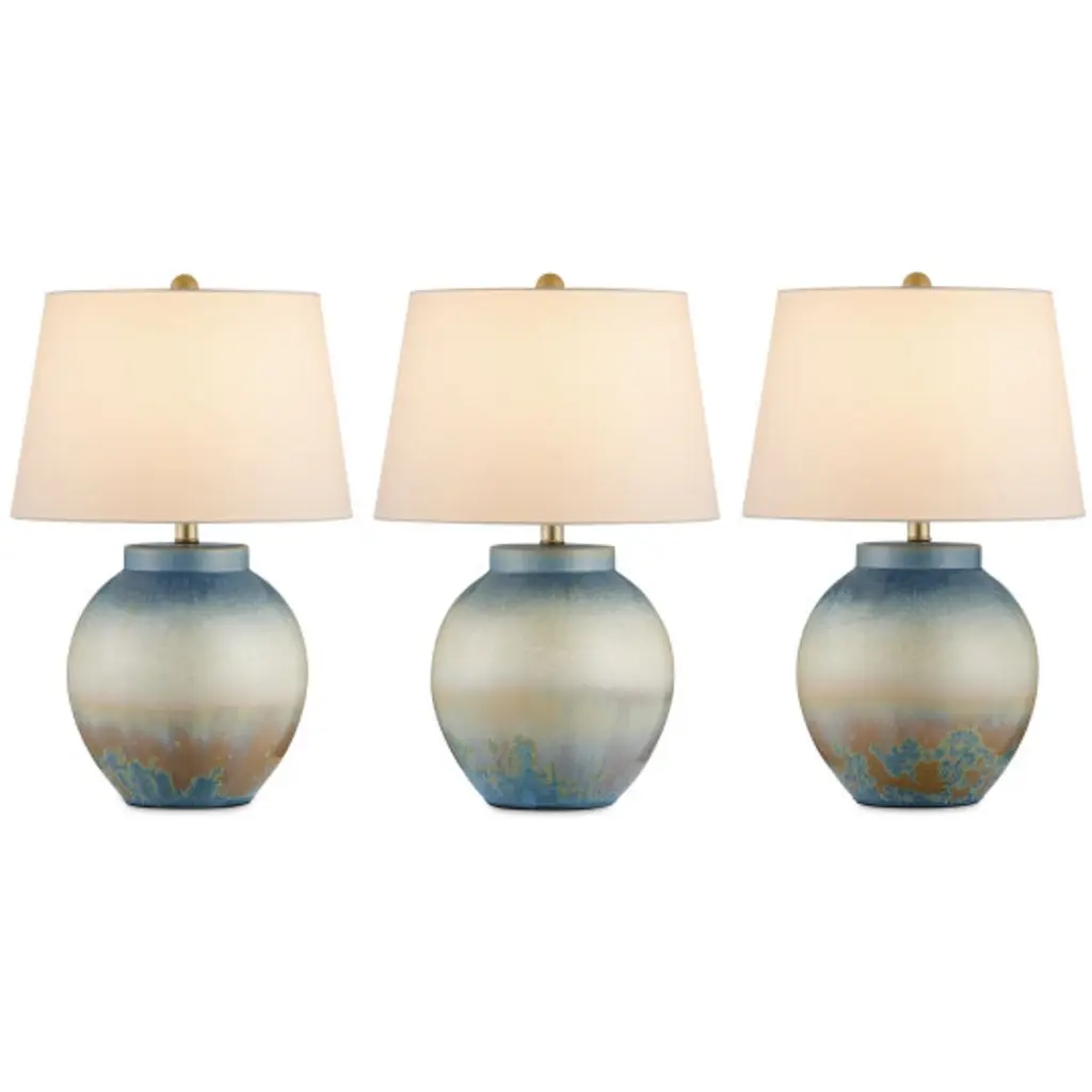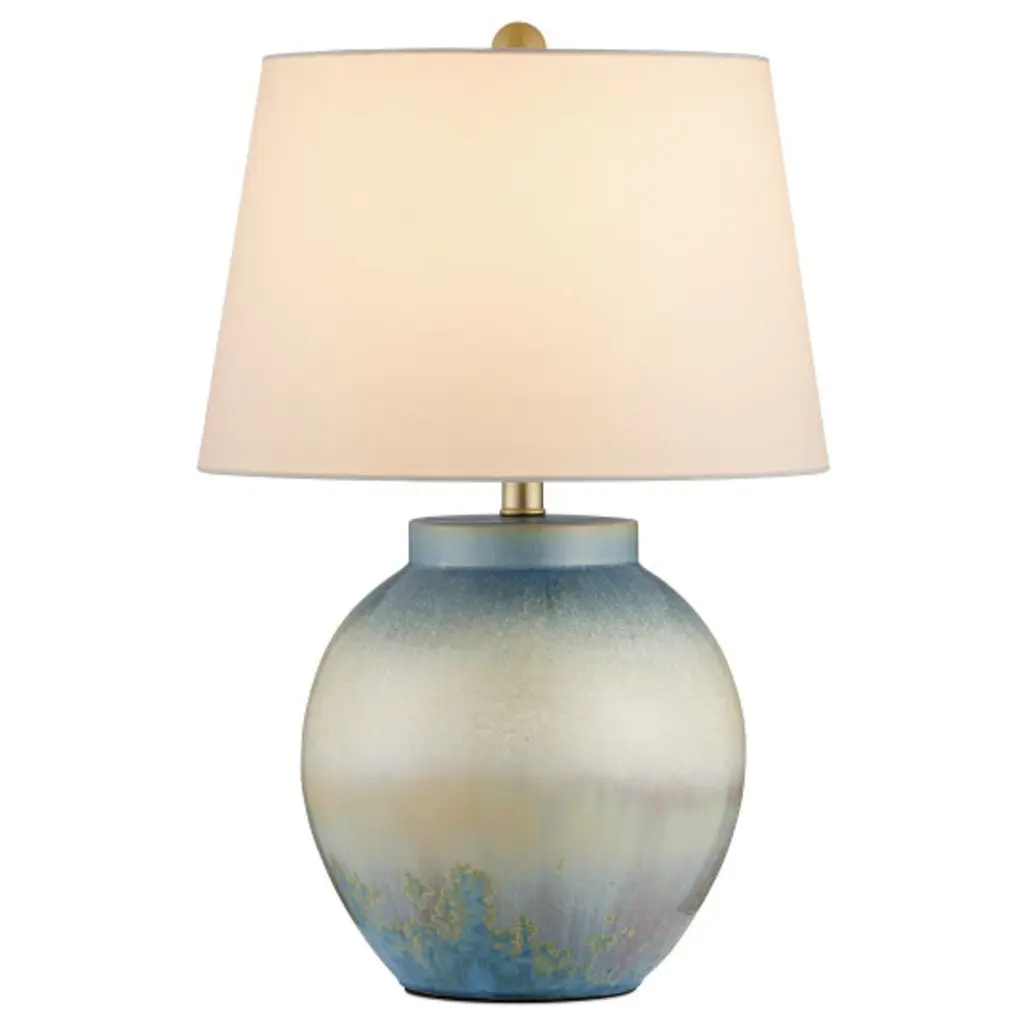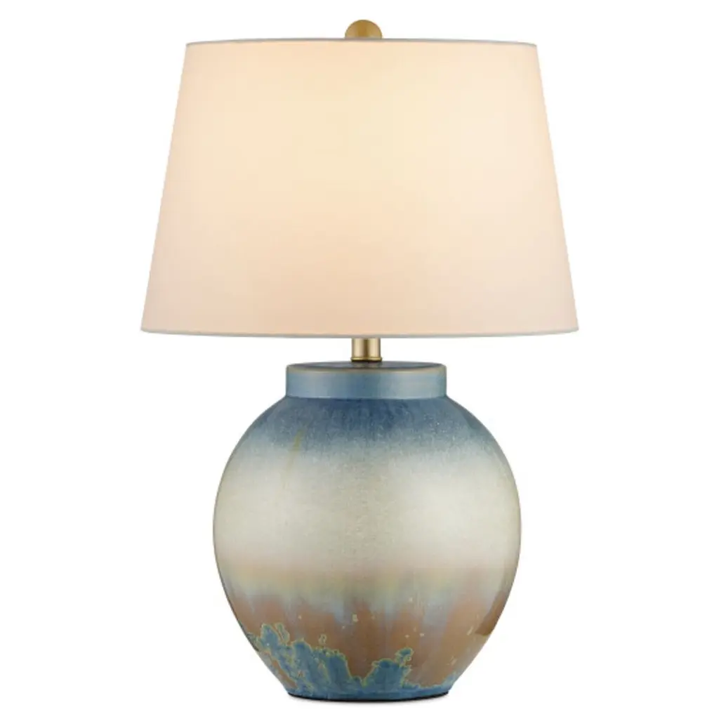 The Dawning Table Lamp features a ceramic body with a uniquely varied surface created through a crystallization process during firing. Multiple layers of different colored glazes react to high kiln temperatures, forming varied surface crystals that flow upward from the base, resulting in one-of-a-kind patterns on every lamp. With tones that evoke a sunrise over the ocean, each piece offers a rich blend of texture, color, and natural movement.