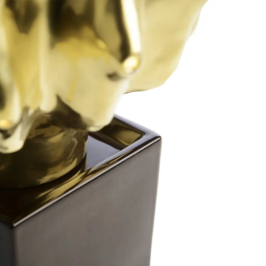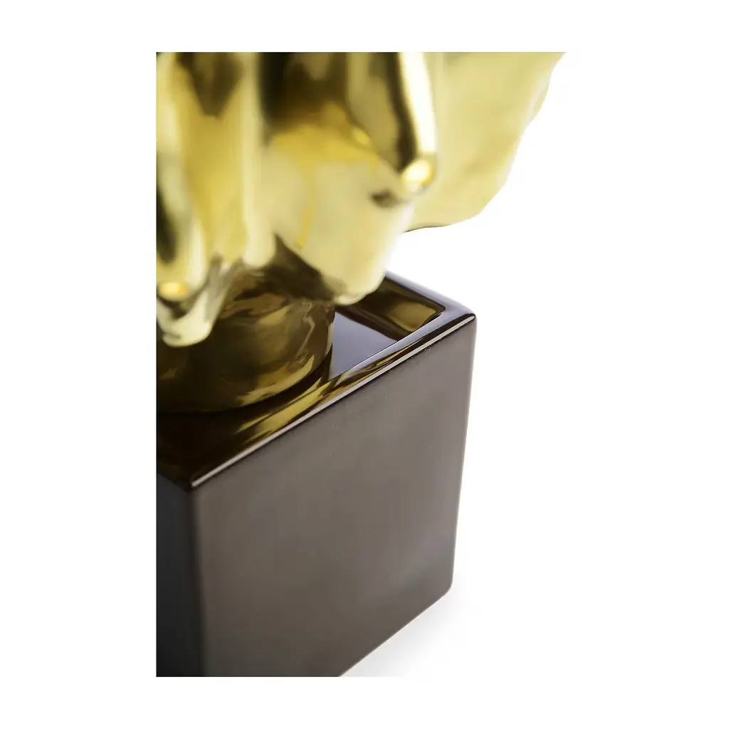 This stunning piece of functional decor will complement a contemporary interior and create striking lighting effect on its surroundings. Supported by a ceramic cube base, the lamp is an asymmetric sphere made also of ceramics with a gold finish and vertical grooves perforated in several areas. From each hole the internal light projects a series of rays creating a unique ambiance. Either on a console in the entryway, or on a side table in the living room, this piece will make an elegant statement and can be combined with the Cos Table Lamp and the Bea Table Lamp.