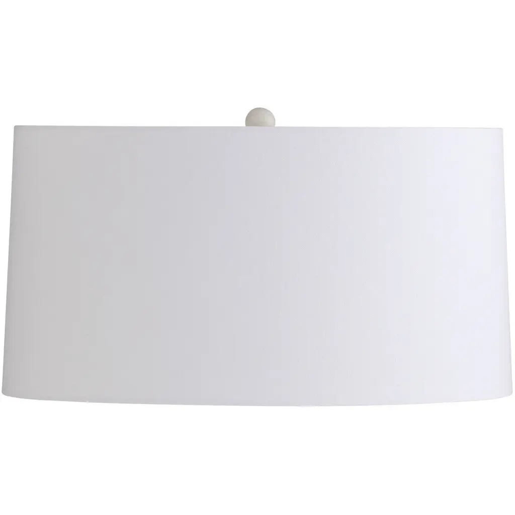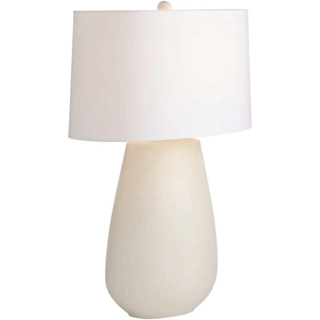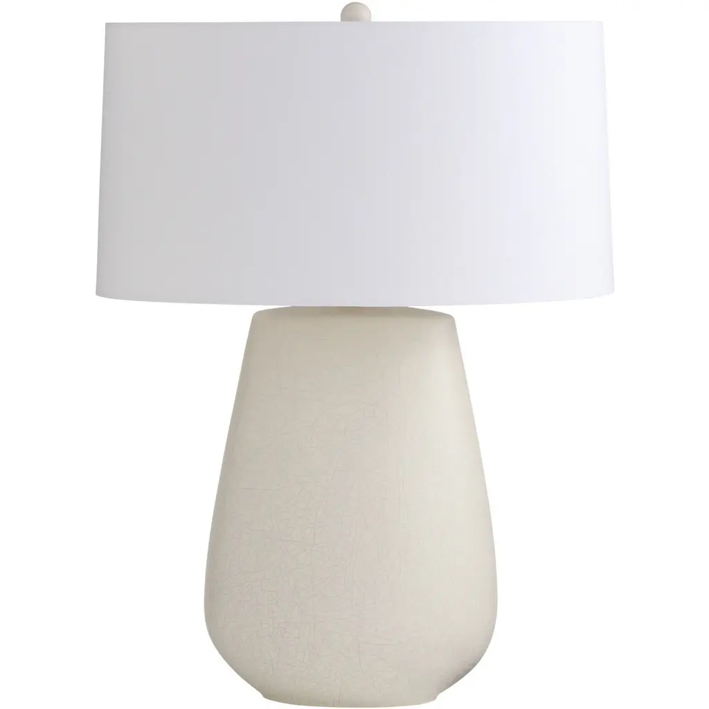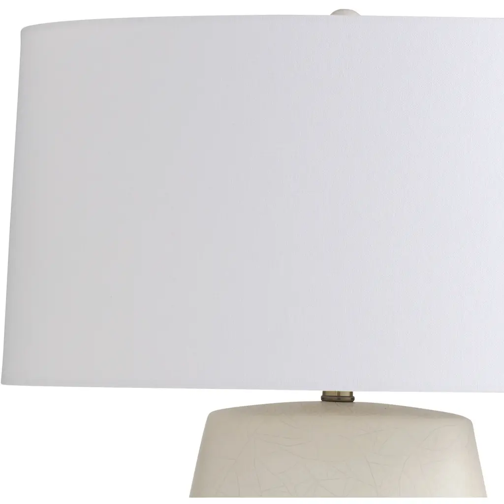 A more neutral interpretation of one of our favorite silhouettes, the porcelain Deagan is finished with a subtle matte ivory crackle glaze and a matching finial. Topped with a white linen oval drum shade lined in white cotton. Finish will vary.