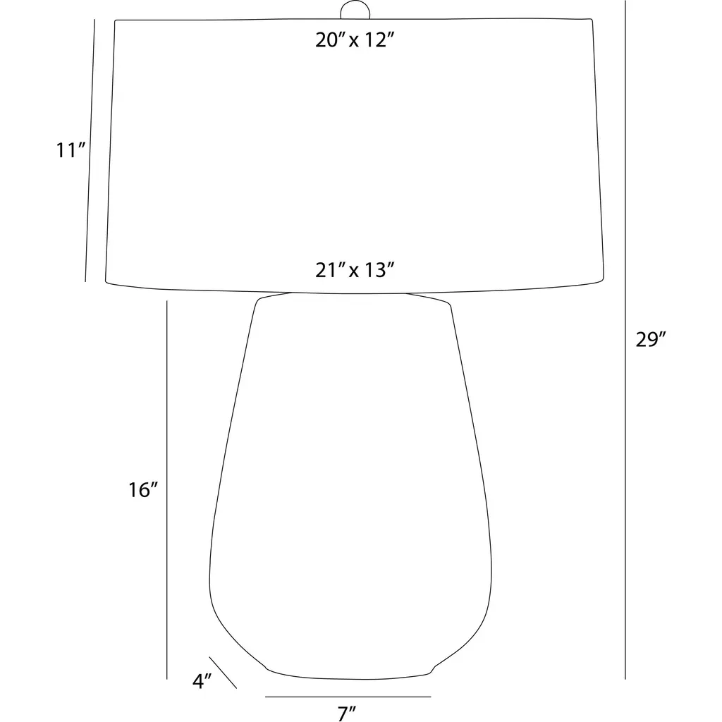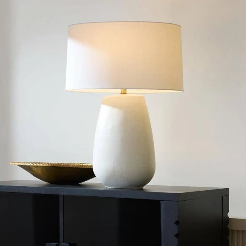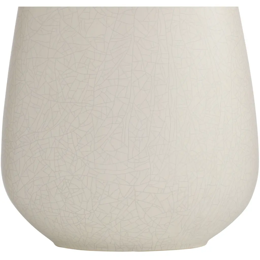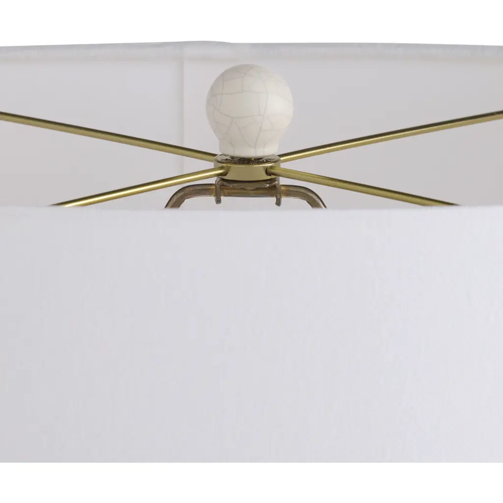 A more neutral interpretation of one of our favorite silhouettes, the porcelain Deagan is finished with a subtle matte ivory crackle glaze and a matching finial. Topped with a white linen oval drum shade lined in white cotton. Finish will vary.
