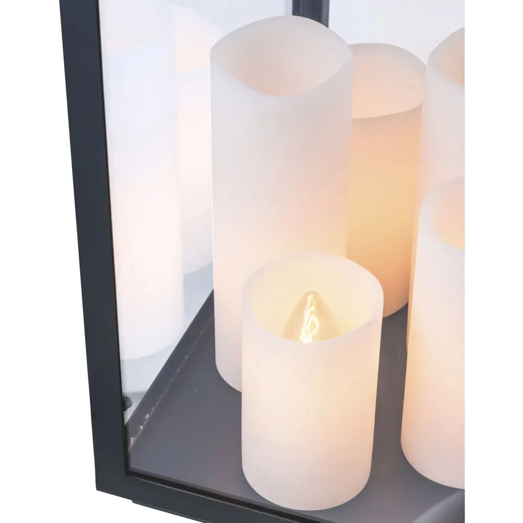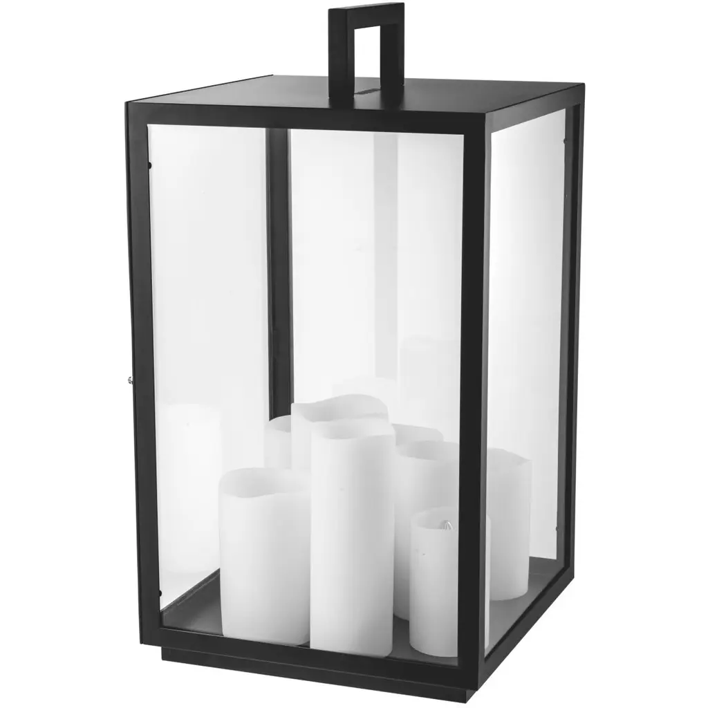 Cast a subtle glow in your lounge, bedroom or entryway with the Debonair Table Lamp. This modern interpretation of a classic lantern is characterised by its simple graphic design and comes with 8 faux candles.