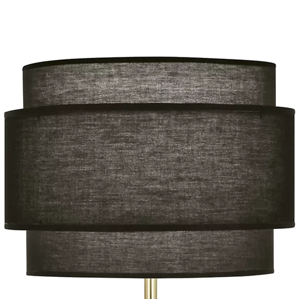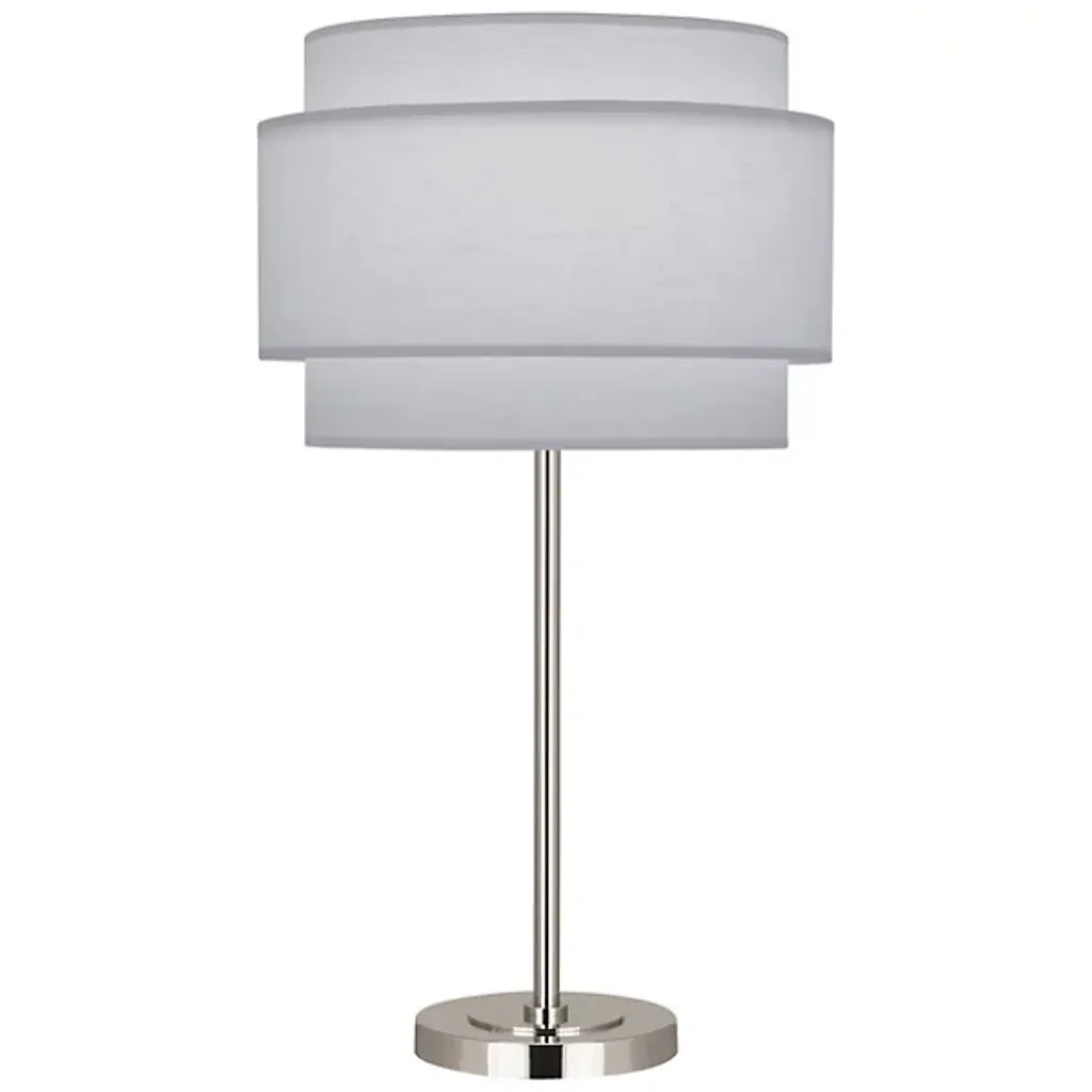 Bring a tastefully-tiered accent to your inside spaces with the simple and elegant Decker Table Lamp from Robert Abbey. Starting simply with a strong stem rising from a stepped-disc metal base to a single-socket lamp, the elegant fabric is accented by a shorter shade that wraps around it, creating an elegant layered effect that adds some shadow and dimension to the glow emanating from the translucent surface. The shade’s open base allows direct light below, providing an intriguing contrast with the ambient warmth that pours through the sides.