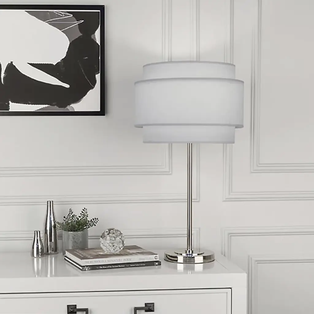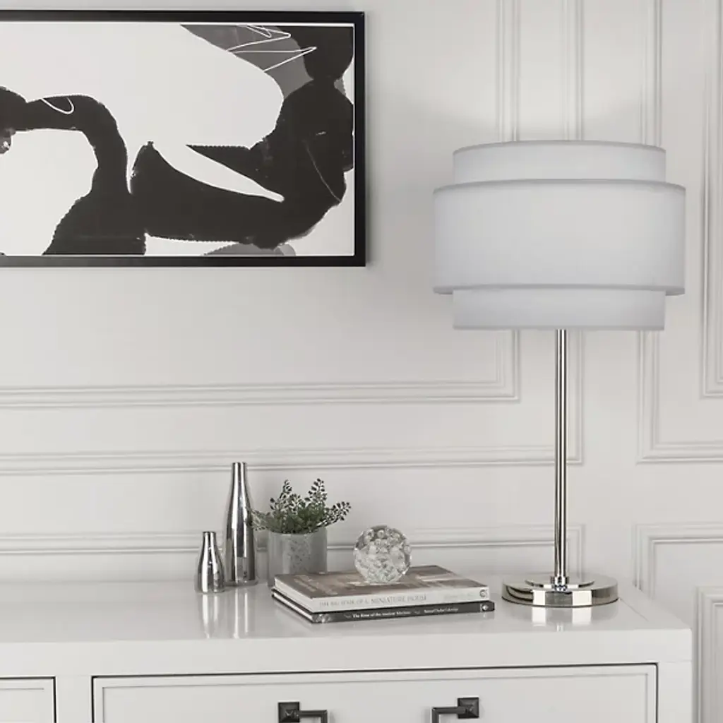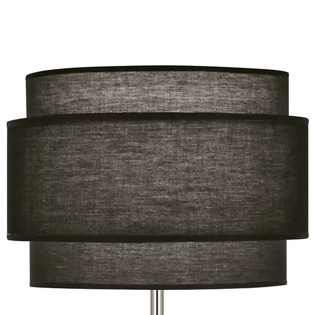 Bring a tastefully-tiered accent to your inside spaces with the simple and elegant Decker Table Lamp from Robert Abbey. Starting simply with a strong stem rising from a stepped-disc metal base to a single-socket lamp, the elegant fabric is accented by a shorter shade that wraps around it, creating an elegant layered effect that adds some shadow and dimension to the glow emanating from the translucent surface. The shade’s open base allows direct light below, providing an intriguing contrast with the ambient warmth that pours through the sides.