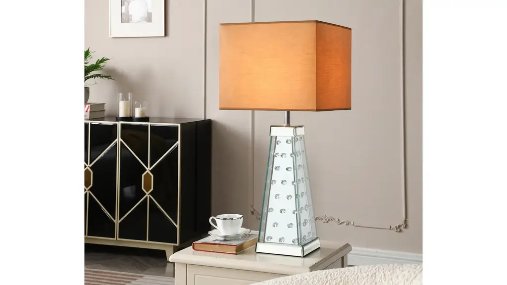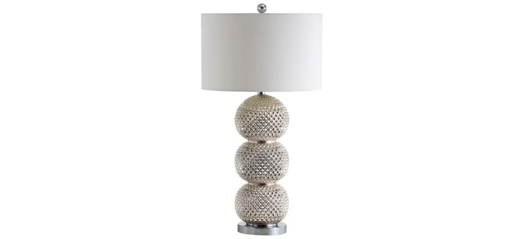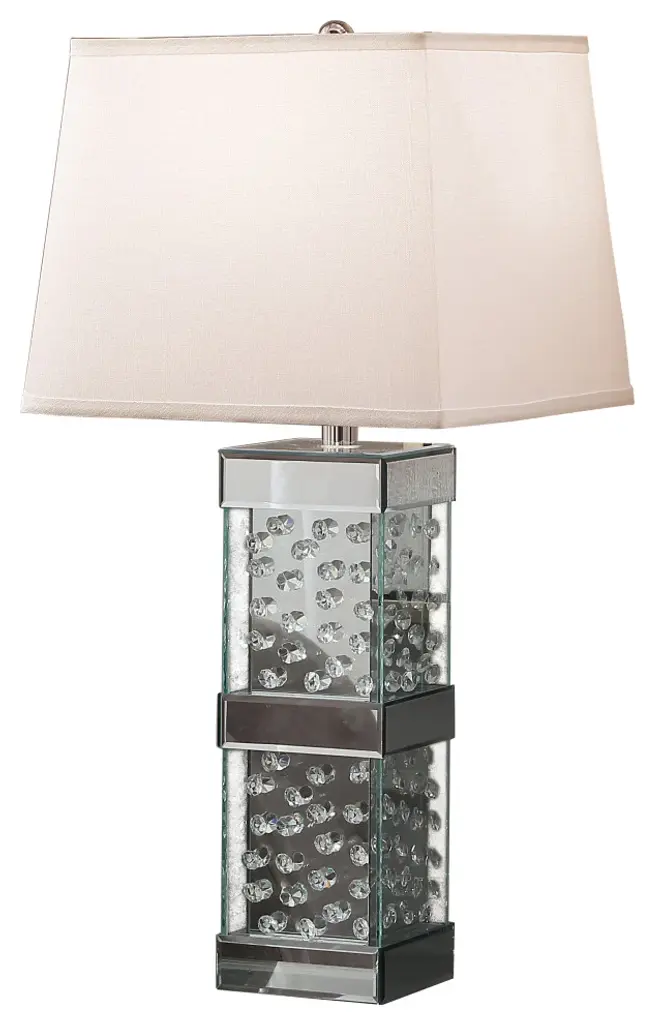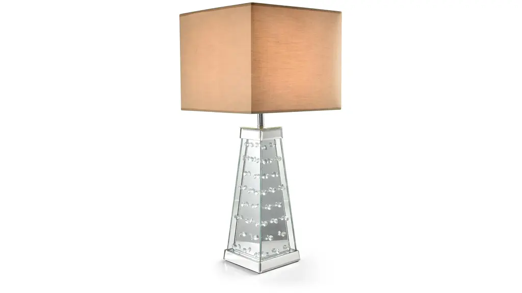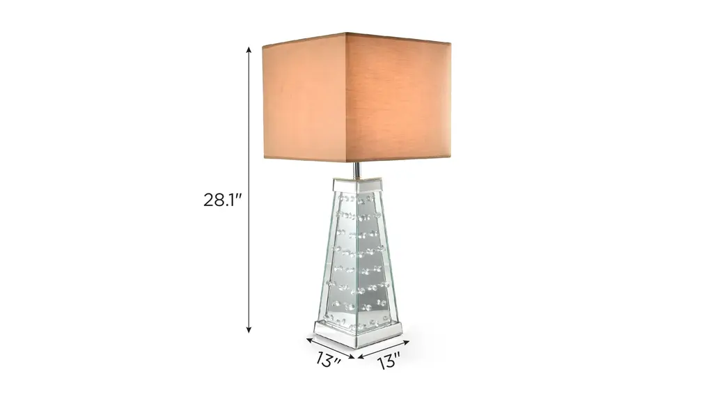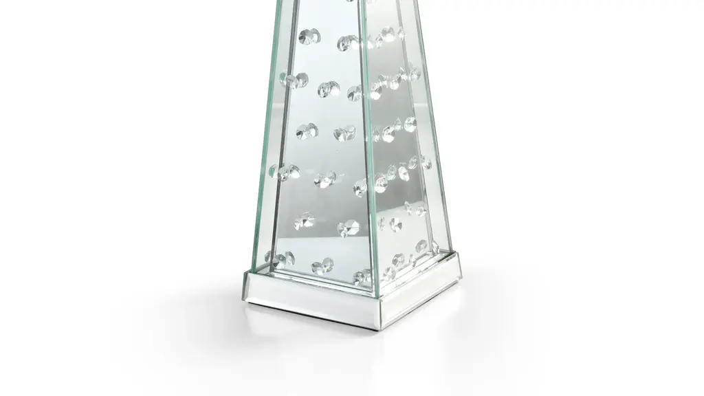 Glass and mirrors are used in this pyramid shaped Decor Table Lamp. Floating bubble design in the glass adds a unique additional design feature. A perfect finishing touch to your room.