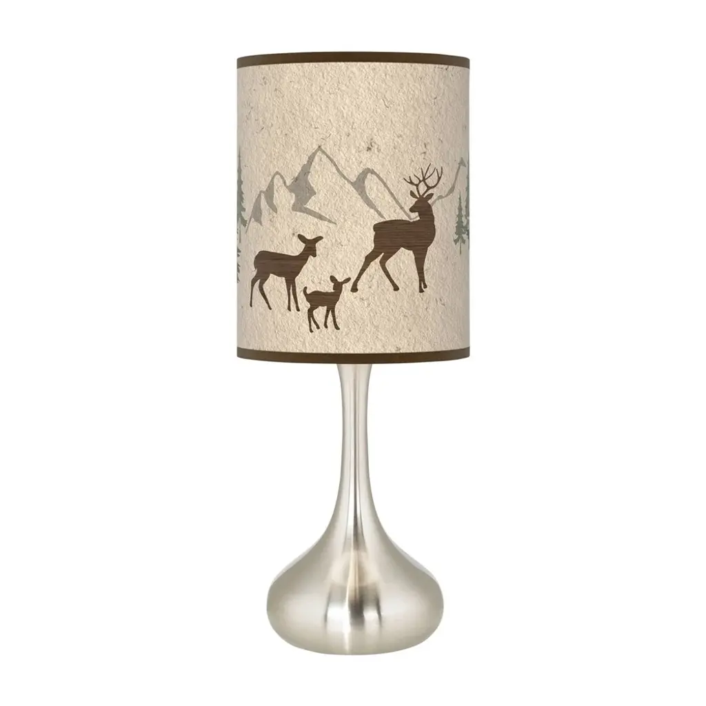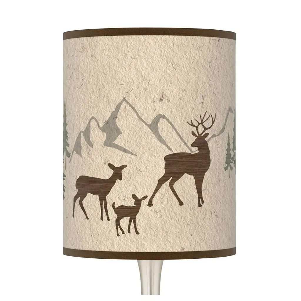 23 1/2" high overall. Base is 7 1/2" wide. Shade is 11 3/4" high x 9 1/2" wide. Uses one maximum 100 watt standard-medium base bulb (not included). In-line on-off switch on the cord. Droplet profile table lamp with a rustic pattern lamp shade from the Giclee Gallery brand. Custom-printed, made-to-order rustic Deer Lodge pattern giclee shade. Uno style shade fitter. Shade printing process U.S. Patent # 7,347,593. Brushed nickel finish. Metal construction. 8-foot long cord.