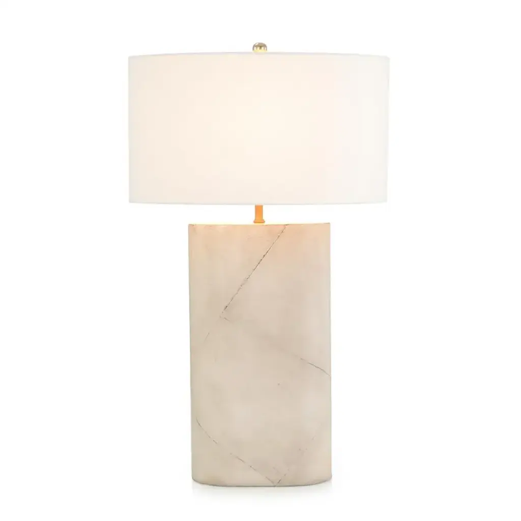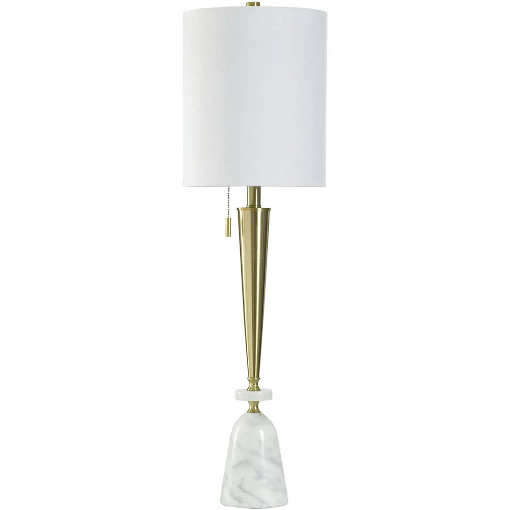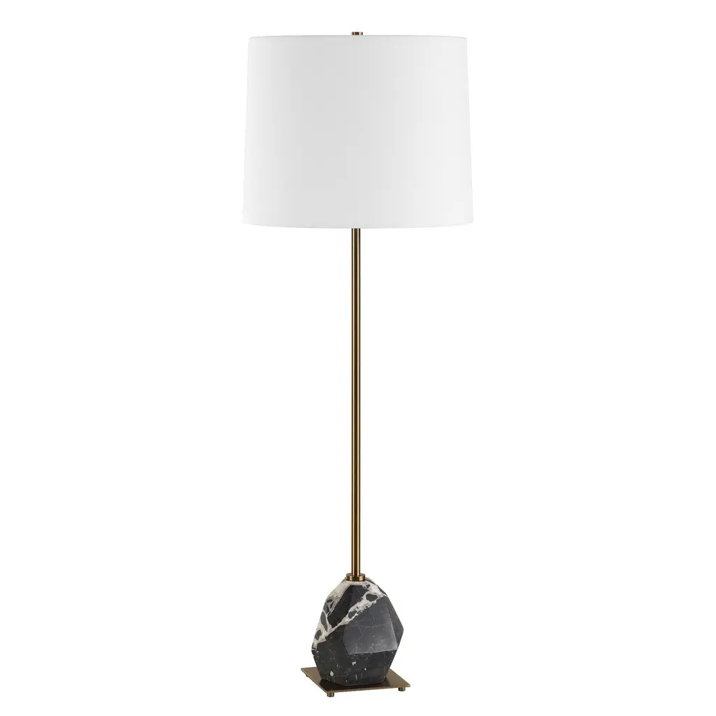 The Delfina Buffet Lamp is a striking blend of artistry and functionality, designed to elevate any space with its sophisticated charm. Its tall silhouette is anchored by an asymmetrical, faceted base crafted from exquisite Panda marble, showcasing a captivating interplay of black and white tones. The natural allure of the stone is further enhanced by elegant antique brass plated accents, creating a harmonious Silvan of materials. Topping this masterpiece is a slightly tapered round hardback shade, enveloped in crisp white linen fabric, offering a soft, inviting glow. Each lamp is a unique work of art, with individual marbling and veining that celebrate the inherent beauty of natural materials.
