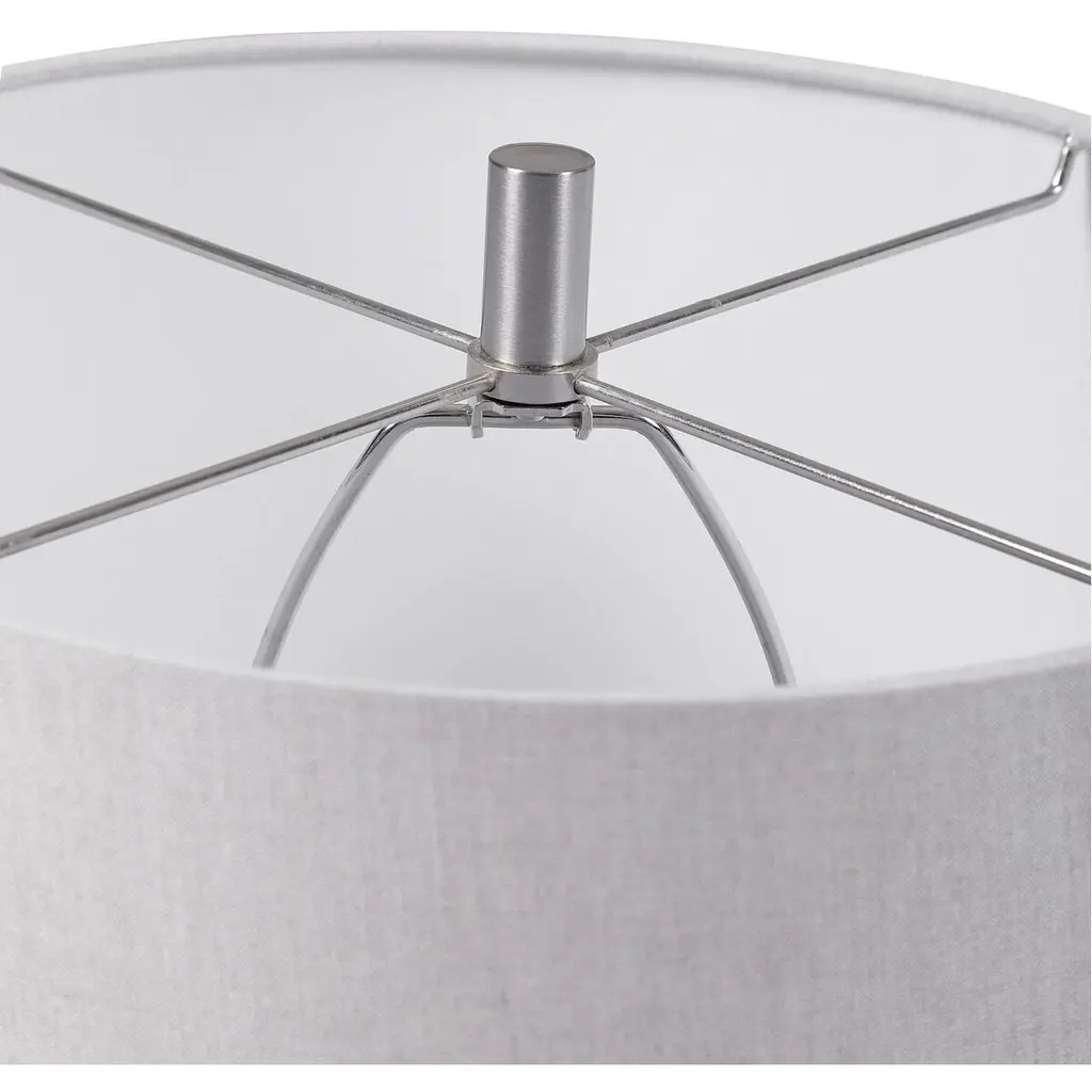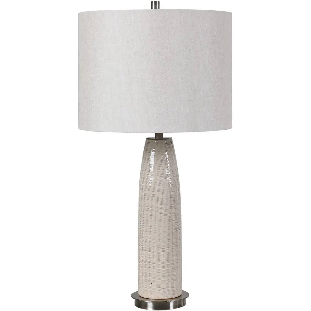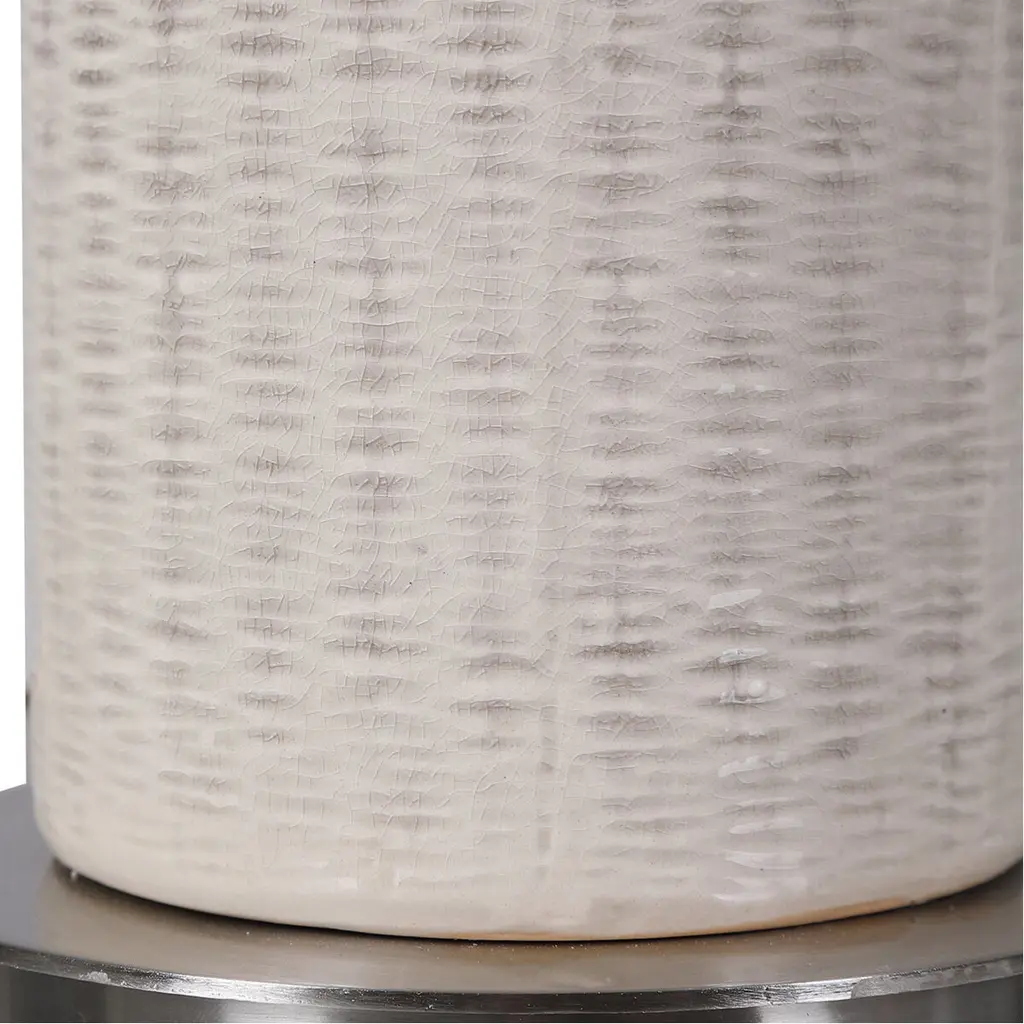 This Ceramic Base Keeps It Simple Yet Upscale With A Fashionable Pattern Finished In A Distressed Light Gray Glaze, Paired With Brushed Nickel Plated Accents. The Hardback Drum Shade Is Light Gray Linen Fabric.