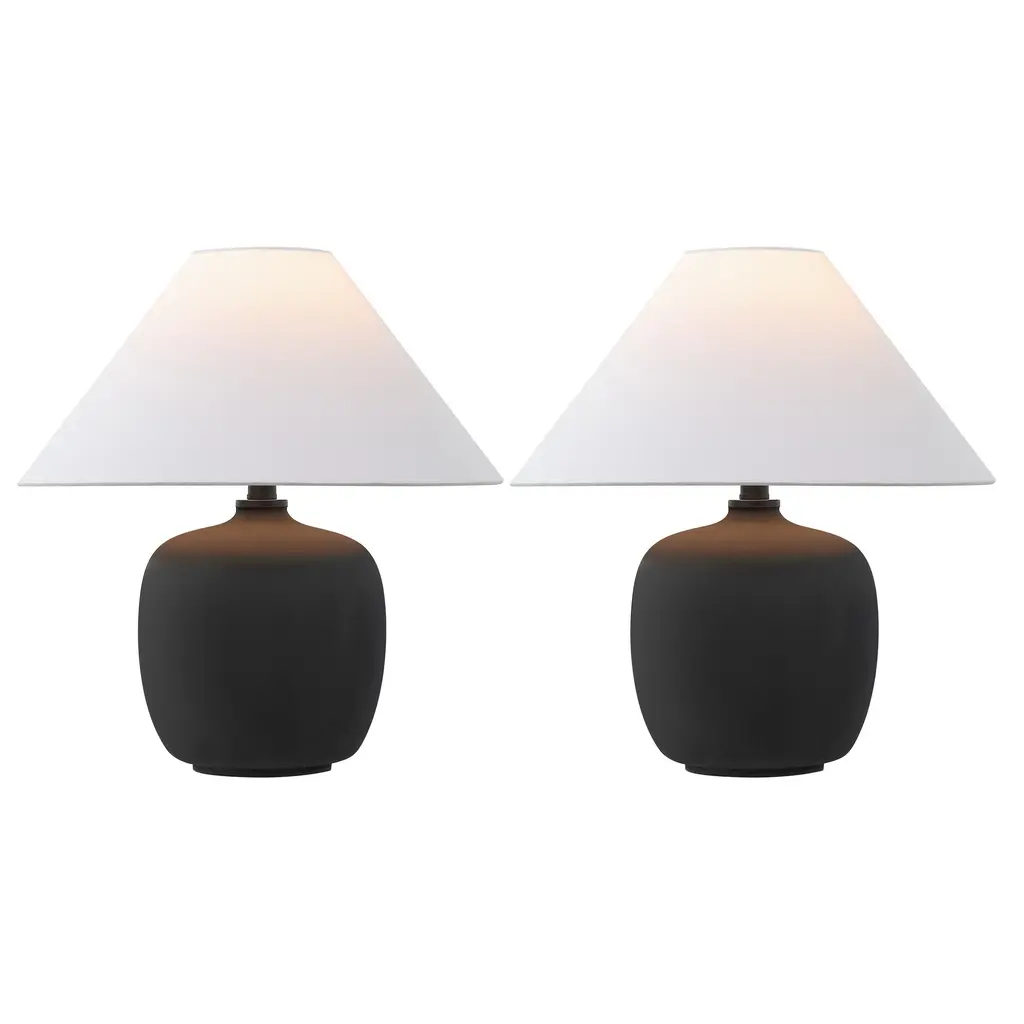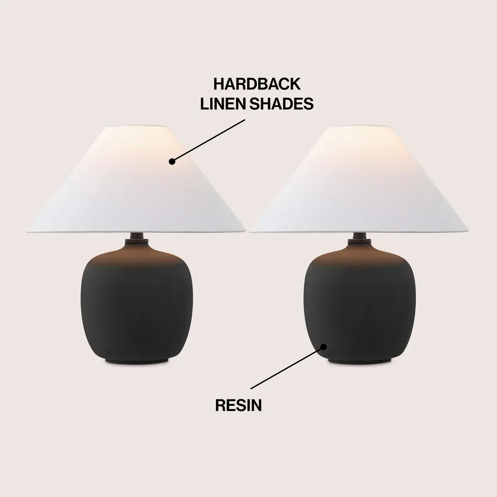Make a bold statement with our pair of minimalist, modern jar lamps. Heavy resin bases in a classic pottery shape are topped with tapered linen shades. The chic matte finish is the perfect low-key addition to a bedroom, office or living room.-Contemporary matte black resin base with a linen-look shade in white-Classic lamp design is perfect for reading, with an LED bulb and rotary switch-These transitional lamps are the perfect pair to flank a sofa or dress up bedside tables-Eco-friendly 9W LED bulb included-Takes 1 bulb and compatible with TYPE "A" 100W or CFL 23W or LED 12WColor: Matte Black with White Shade-Body Material: Resin-Includes: Two (2) lampsAssembly RequiredLamp: 18.25 inches high x 17 inches wide x 17 inches deepAbout us: You see a lamp.We see a decorative work of art.A perfectly curved shade casts a dramatic shadow on a floor. Compatible with LED lightbulbs: as easy on the environment as they are on the eyes. The JONATHAN Y Lighting collection considers every detail from impeccably sourced materials to designer styling. And our prices are so attractive, we've transformed a functional necessity into a fashion accessory.JONATHAN Y Lighting - a fashion revolution in home decor.