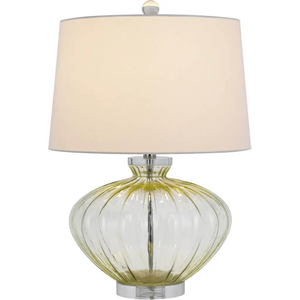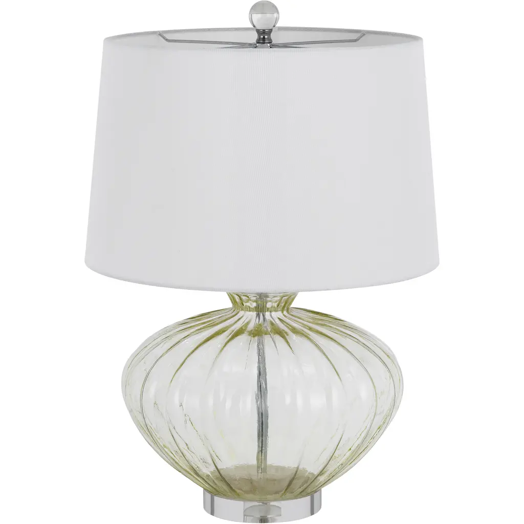 Brighten your décor with this matching pair of tinted glass table lamps. They feature a pump shape design with a circular crystal base. These lamps ship complete with compliementing white shades.