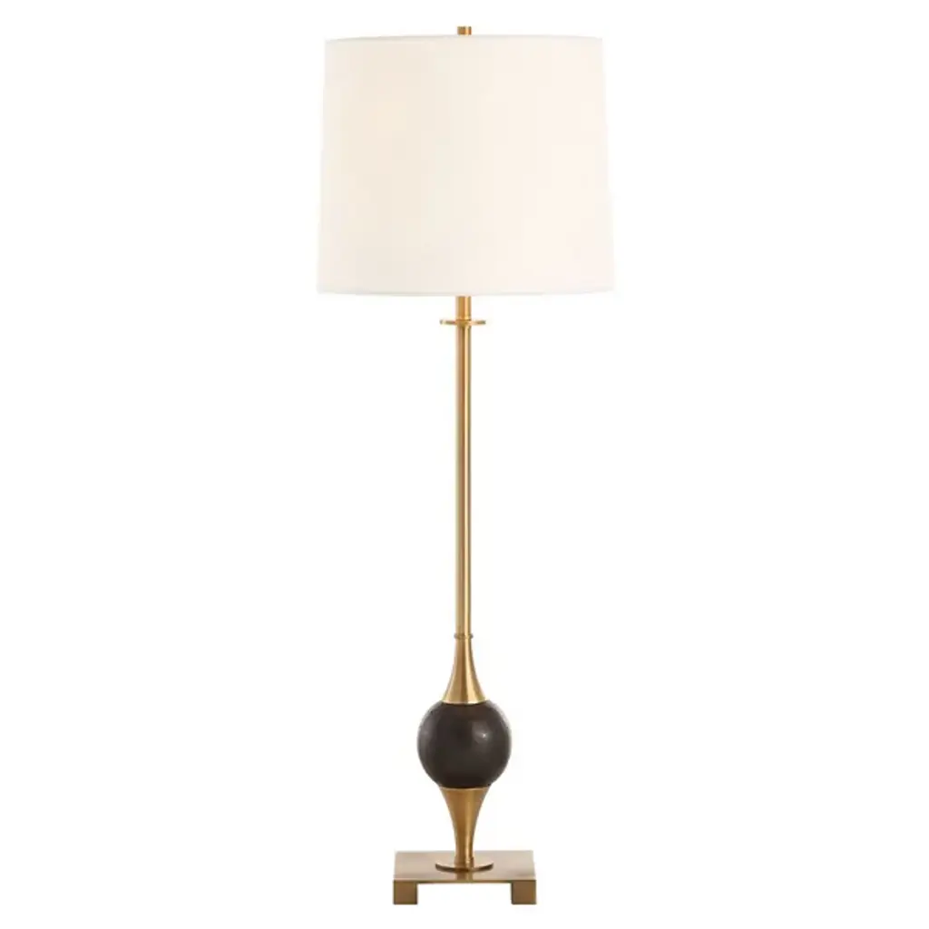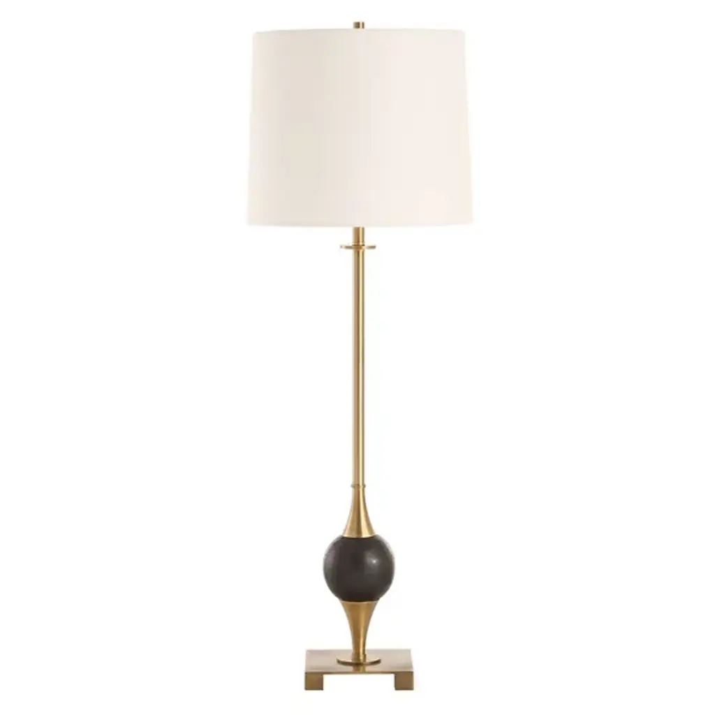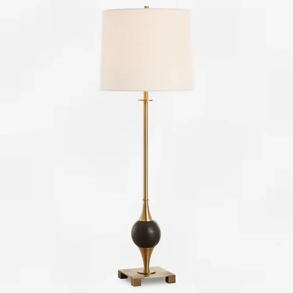 The Dempsey Buffet Lamp from Uttermost centers on a mysterious black dolomite marble orb that seems to float between brass elements. John Kowalski's design plays with gravitational expectations - the weighty marble appears to defy physics as it hovers above the square base. The brass stem rises confidently upward, creating a pleasing vertical line that draws the eye naturally to the tailored linen shade. This lamp brings an artistic sensibility to any space while maintaining clean lines and purposeful design choices.