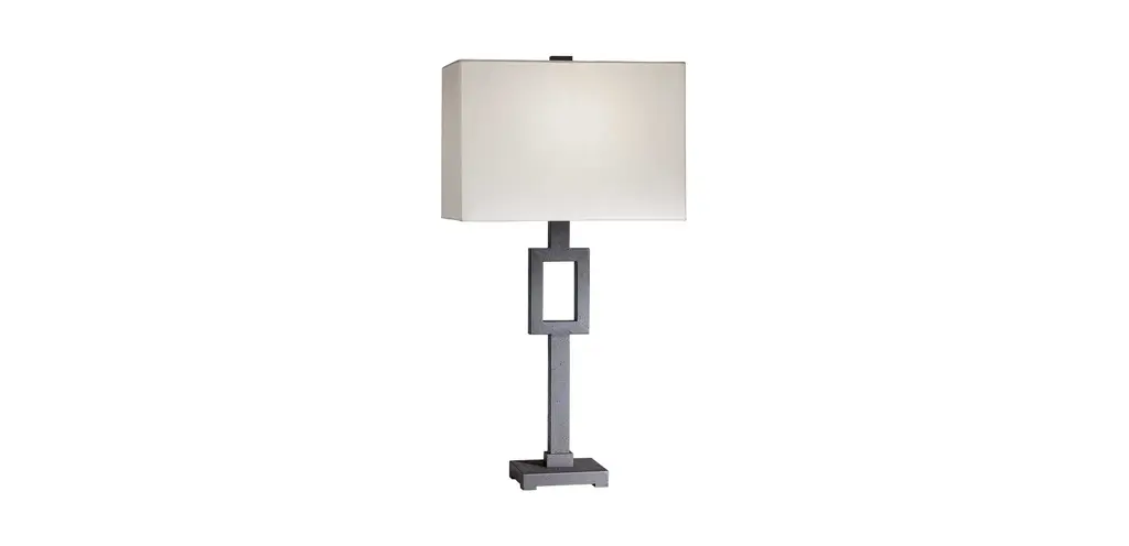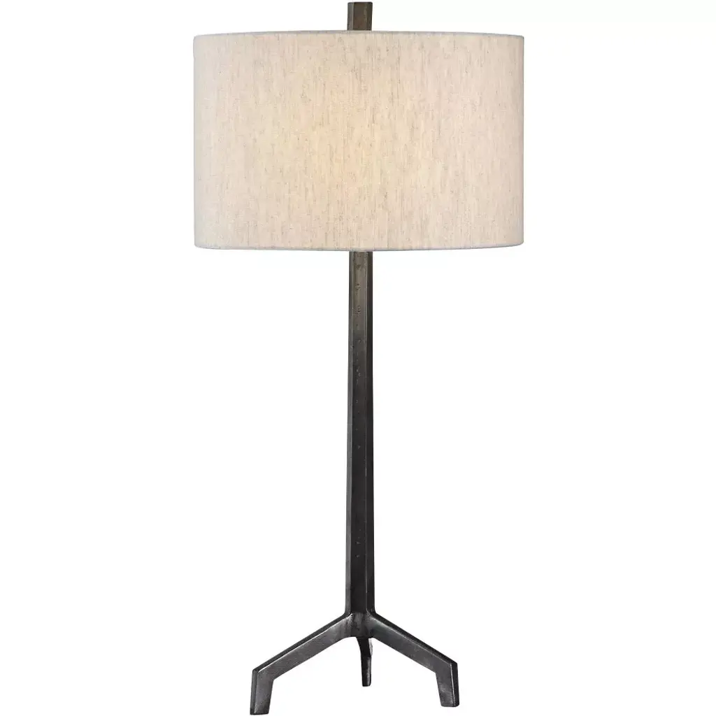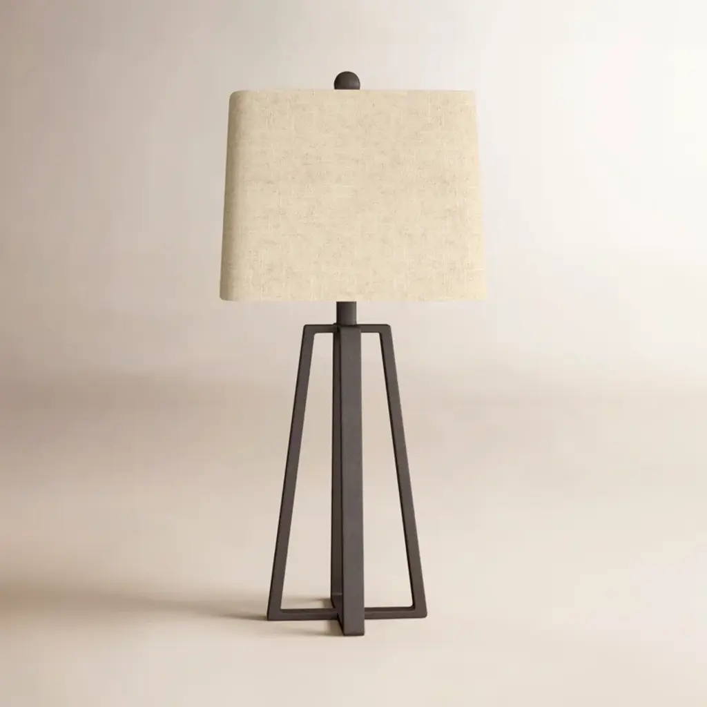 The rustic bronze base of the Denison table lamp facilitates an industrial appearance with modern lines and a linen shade.