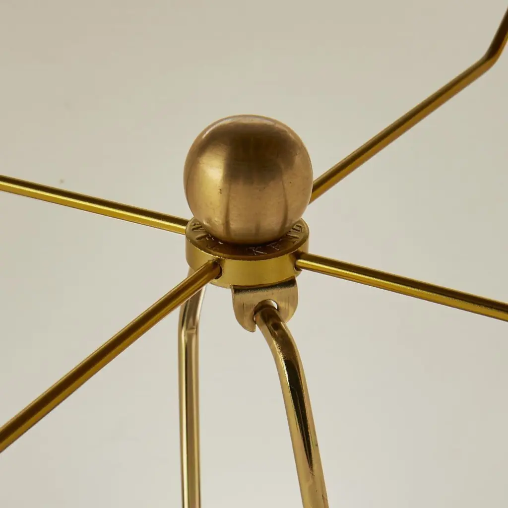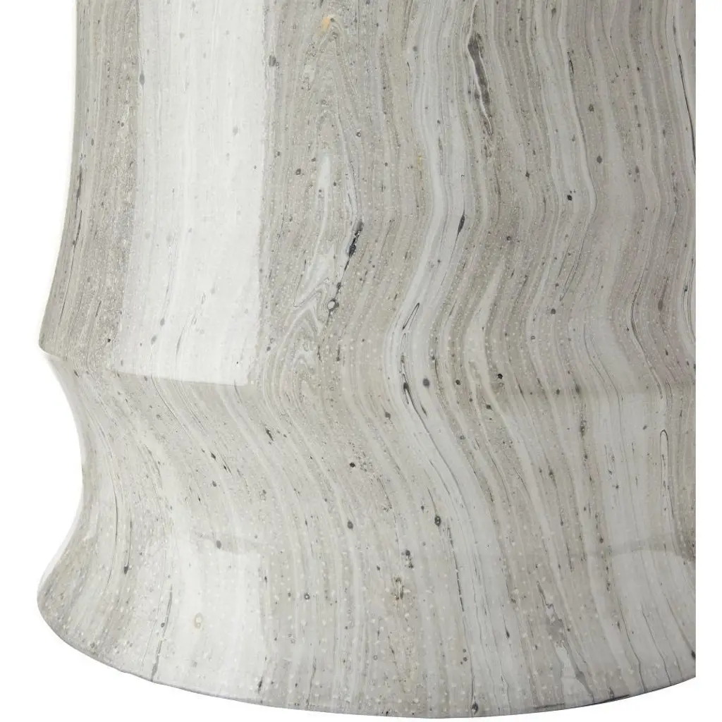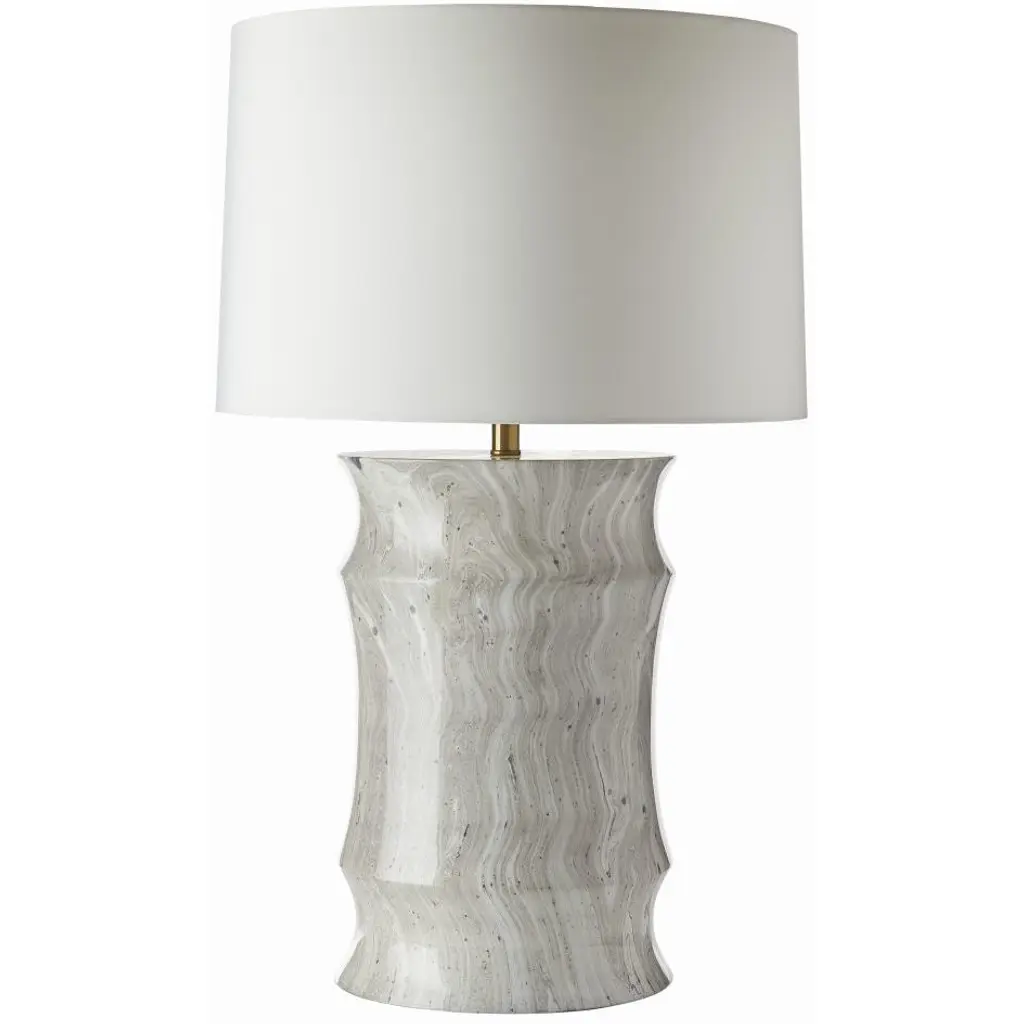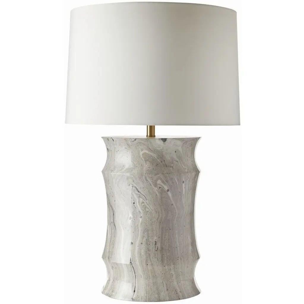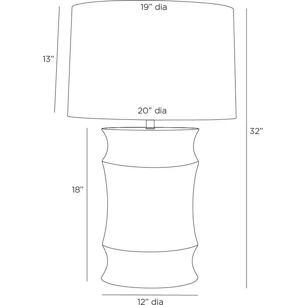 The naturally curved form of a bamboo stalk influenced this over-scaled style. Crafted of hydroprint resin in a moon storm shade, the subtle gradations in color are complemented by antique brass hardware. Off-white microfiber drum shade and antique brass finial. Finish will vary.