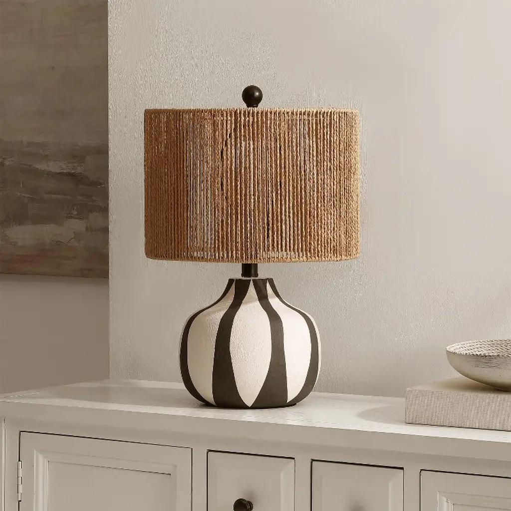 Introducing the DEVI 19.5 inch Cream/Black Ceramic Table Lamp, a delightful addition to your living space. This lamp combines effortless style with functionality, making it a must-have for those who appreciate elegant decor. The ceramic body offers a sleek and modern look, while the rattan shade brings a touch of nature indoors, perfectly blending contemporary and rustic elements. The soft two-tone color palette of cream and black complements a variety of interior designs, providing versatility in placement. Whether it's gracing a bedside table or illuminating a cozy reading nook, the DEVI lamp sets the mood with a warm, inviting glow. Measuring 19.5 inches, it stands as a fitting centerpiece without overwhelming your room's aesthetic. Elevate your home ambiance with this design-forward table lamp. The DEVI 19.5 inch Cream/Black Ceramic Table Lamp is not just an accessory but an expression of sophisticated taste and aesthetic harmony. Embrace the charm and character it brings to your home.