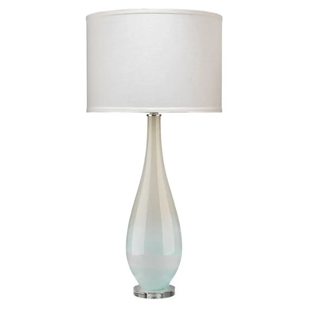 A simple silhouette is paired with pale colors of taupe, sky blue and white to elicit a light and delicate feel to this large-scale lamp. Embracing it’s name, the sight of the Dewdrop Table Lamp brings to mind the water and air caught in a drop of dew in the sunlight. Finish will vary, color and pattern will vary in blown glass. Lamp Base: 5"dia. acrylic base. Lamp body: 6.5"w.