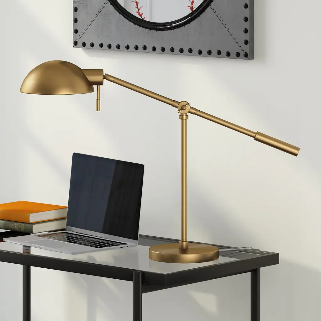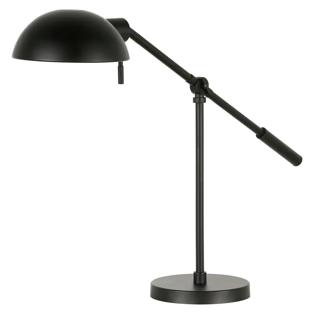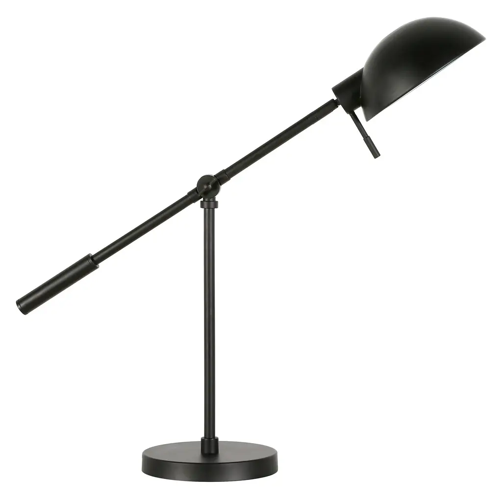 Upgrade the lighting of your desk, craft table, or bedside with this modern update of a classic task lamp. The low-profile design has a boom-style arm that can be adjusted to cast light at a variety of angles. A sleek dome-shaped metal shade creates ample downward illumination, making this the perfect lamp for your reading nook, home office, or bedroom. Features: Features an adjustable boom arm Paired with a dome-shaped shade. Shade is made of metal. Rated for one 60W incandescent bulb; 9W LED bulb, 13W fluorescent (CFL) bulb, or 9W self-ballasted LED bulb. E26-base bulb. Includes a 6 ft. cord. Clean with a soft, dry cloth; no harsh chemicals or abrasive cleaning materials.