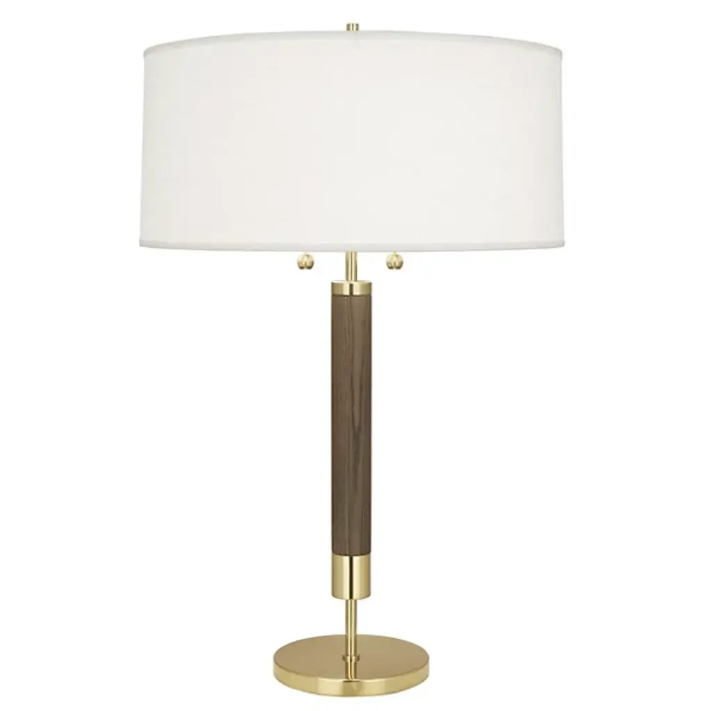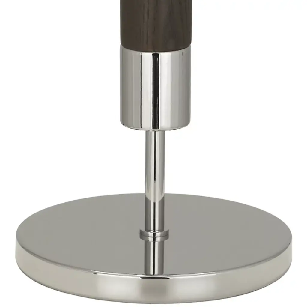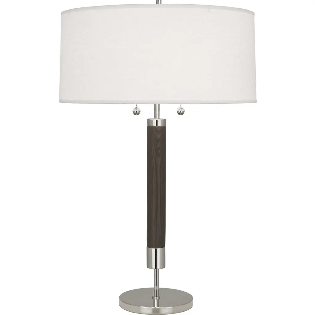 Retro minimalism with maximum appeal. The Dexter Table Lamp by Robert Abbey adds a mid-century flair while softly illuminating a home or office. The narrow cylindrical body is comprised of wood with sleek steel accents at each end, while the rounded steel base adds to its vintage look. A round fabric shade softly diffuses the lamps incandescent light while dual pull chains allow for easy on and off access to its hi-lo switch.
