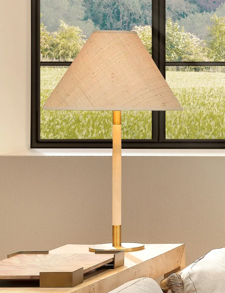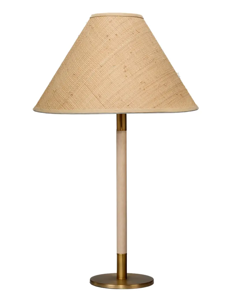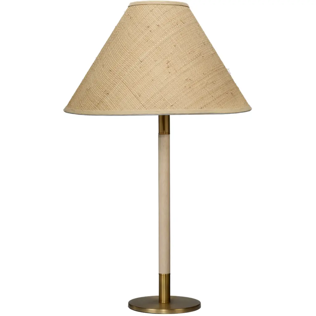 The Dey lamp offers a beautiful mix of materials in one thoroughly refined design. Its shade is handwoven with raffia, echoing the organic tone of the light wood stem. Brass-finished accents at its base and top complete the look with a touch of polishstyling a versatile table lamp for transitional decor.