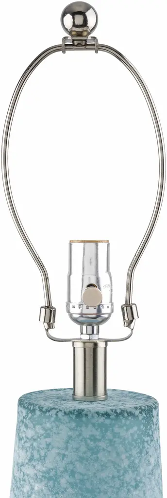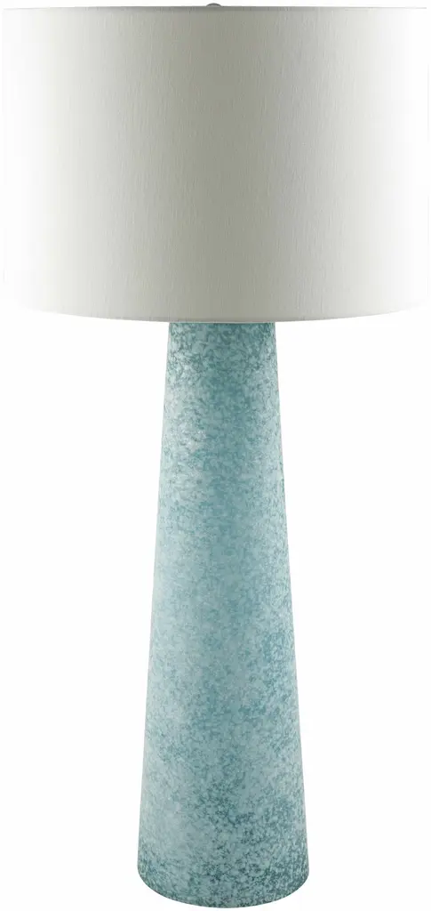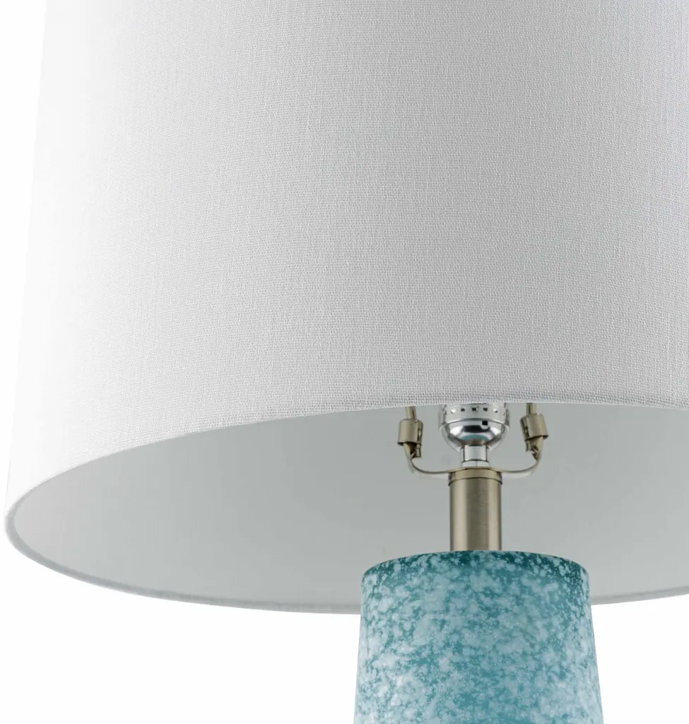 Collection: Dhulikhel Colors: White, Teal, Light Blue Material: Body: Glass,Shade (Outside): Linen,Shade (Inside): Metal,Finial: Iron Made In: China Shade Material: LinenMetal Shade Color: WhiteWhite Cord Length: 6' Switch Type: 3-Way Number of Bulbs: 1 Socket Type: E-26 Bulb Wattage: 150W