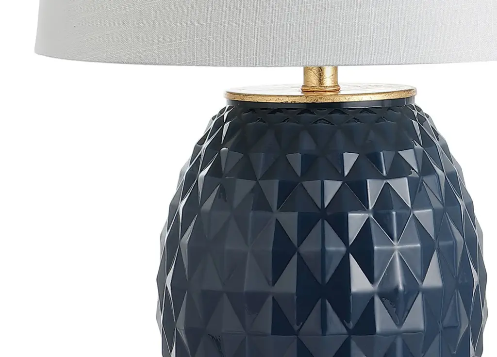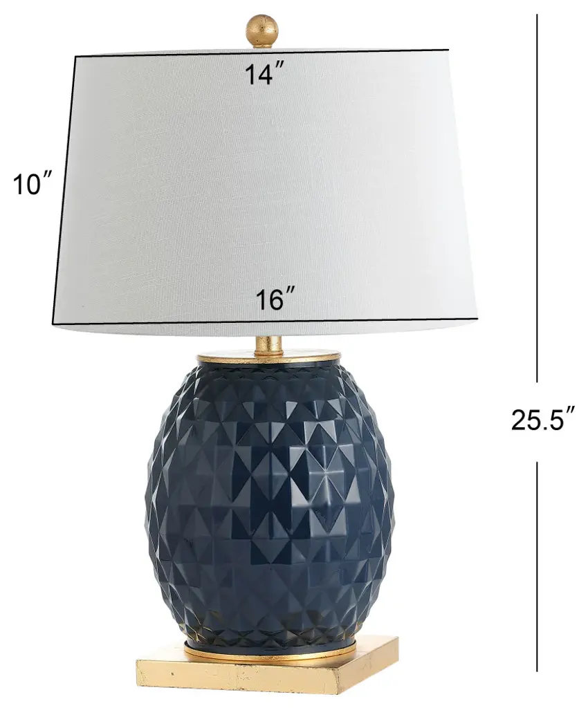 Made of textured ceramic with a navy blue glaze to highlight the diamond-quilted motif, this chic table lamp is accented with a gold leaf base and finial. The combination of gloss and gilding is both contemporary and glam, and would be suitable for a variety of home decor styles. With style that extends all the way to the silk-wrapped cord, this piece shines in more way than one. -Glazed ceramic gets a modern update in a diamond texture and gold-leaf base -100% cotton hardback drum shade-Beautiful to display or easy to conceal: the 60" cord is silk-wrapped-On-off rotary switch on socket-Takes one maximum 100 watt or equivalent bulb (one LED bulb included)-Eco-friendly 9W LED bulb included-UL Listed-Color: Navy/Gold Leaf with white shade-Body Material: Glass / Metal-Base Material: Iron-Finial Material: N/A-Finial Color: N/A-Harp Color: N/A-Includes: 1 lamp(s)-Minor Assembly Required-Lamp: 25.5 inches high x 16 inches wide x 16 inches deep-Shade: 10 inches high x 16 inches wide x 16 inches deepYou see a lamp.We see a decorative work of art.A perfectly curved shade casts a dramatic shadow on a floor. A silk cord you never want to hide. LED lightbulbs: as easy on the environment as they are on the eyes. The JONATHAN Y Lighting collection considers every detail from impeccably sourced materials to designer styling. And our prices are so attractive, we''ve transformed a functional necessity into a fashion accessory.JONATHAN Y Lighting - a fashion revolution in home decor.