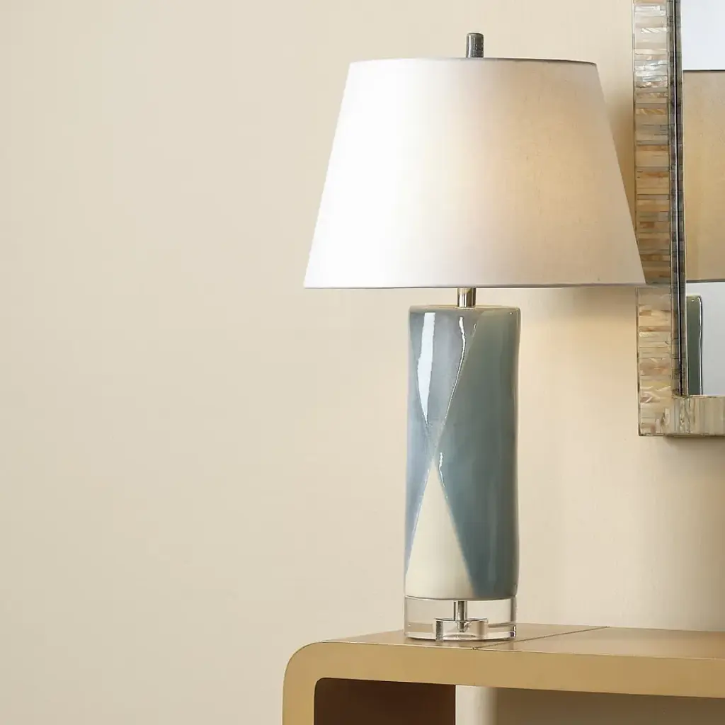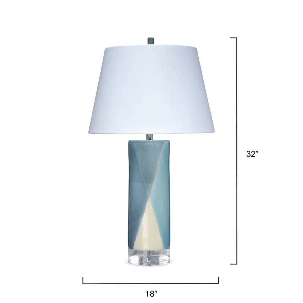 A wonderful feeling of calm is evoked in this enchanting table lamp. The handcrafted ceramic body seems to float above its resin base, and the clever diamond design draws the eye up to a tapered shade in crisp, cool, white linen. A coordinating ceramic finial adds the final touch. This lovely lamp will add a feeling of brightness to your room, even when it isn’t lit, and is ideal for decors from coastal to country.