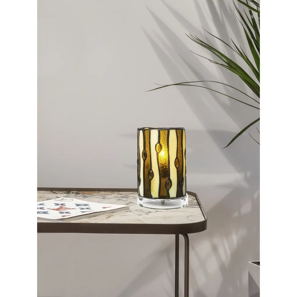 The Diamond Hill Dale Tiffany Accent Lamp is a stunning uplight nightlight that exudes timeless elegance. Crafted to resemble a grand candle, it radiates a warm glow in shades of amber and soft yellow, reminiscent of a serene sunset. This exquisite piece is meticulously designed using the traditional Tiffany method, with copper foil soldering that binds the lamp's intricate patterns. Adorning the lamp are delicate amber-colored glass beads, adding a touch of sophistication and sparkle. The lamp stands on a clear acrylic base, ensuring stability while allowing its beauty to take center stage. This lamp is compact yet makes a bold statement, making it a perfect addition to any room or decor.