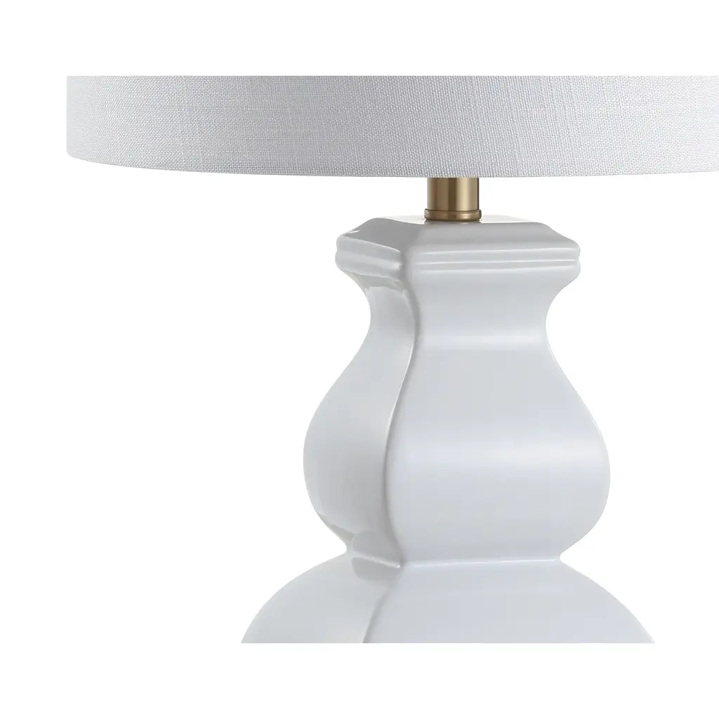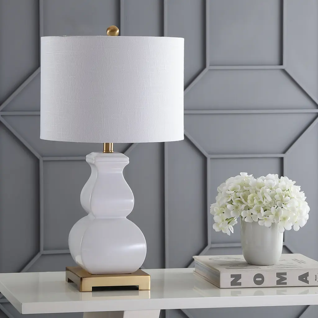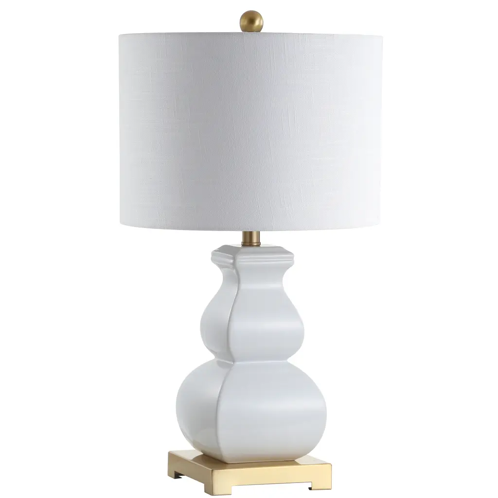 Footed vases have long been popular ways to display vases and objects, but are seldom seen in modern lighting -- until now. The glossy glazed ceramic base is perched perfectly atop a golden metal stand, adding decorative interest without taking away from this table lamp's broad appeal and versatility. A hardback linen drum shade and gold finial top the look. Features:Dimensions:About us:You see a lamp.We see a decorative work of art.A perfectly curved shade casts a dramatic shadow on a floor. A silk cord you never want to hide. LED lightbulbs: as easy on the environment as they are on the eyes. The JONATHAN Y Lighting collection considers every detail from impeccably sourced materials to designer styling. And our prices are so attractive, we've transformed a functional necessity into a fashion accessory.JONATHAN Y Lighting - a fashion revolution in home decor.