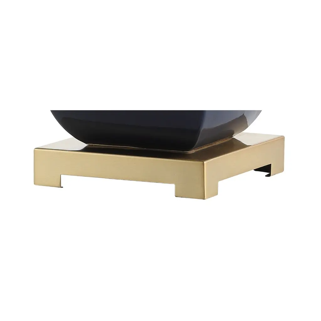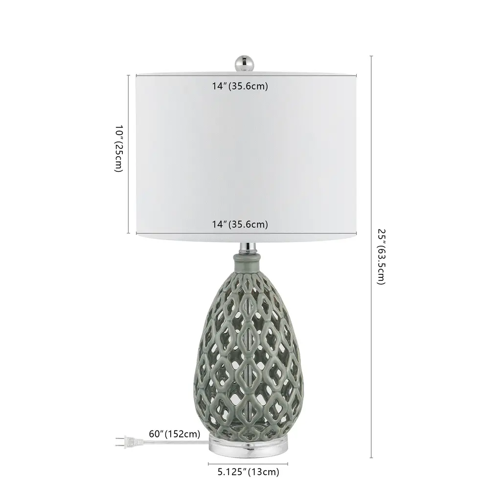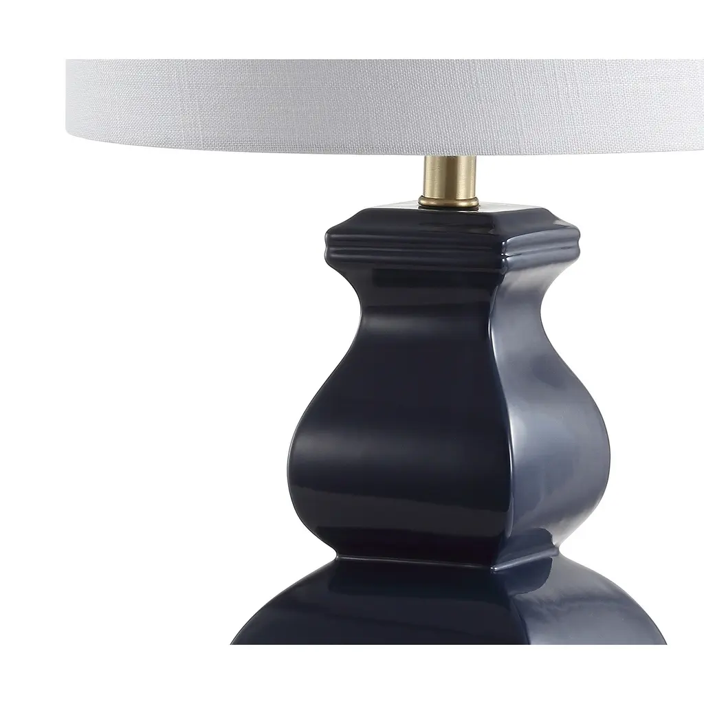 Footed vases have long been popular ways to display vases and objects, but are seldom seen in modern lighting -- until now. The glossy glazed ceramic base is perched perfectly atop a golden metal stand, adding decorative interest without taking away from this table lamp's broad appeal and versatility. A hardback linen drum shade and gold finial top the look. Features:Dimensions:About us:You see a lamp.We see a decorative work of art.A perfectly curved shade casts a dramatic shadow on a floor. A silk cord you never want to hide. LED lightbulbs: as easy on the environment as they are on the eyes. The JONATHAN Y Lighting collection considers every detail from impeccably sourced materials to designer styling. And our prices are so attractive, we've transformed a functional necessity into a fashion accessory.JONATHAN Y Lighting - a fashion revolution in home decor.