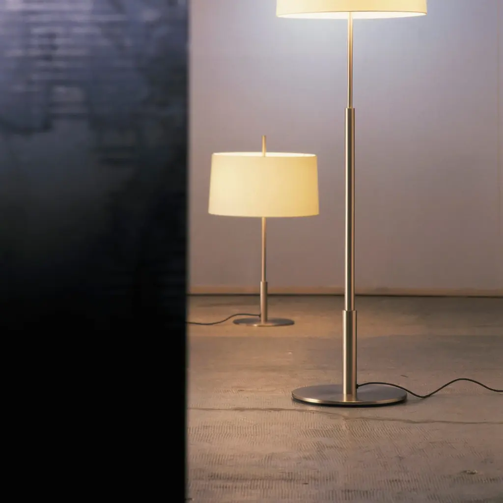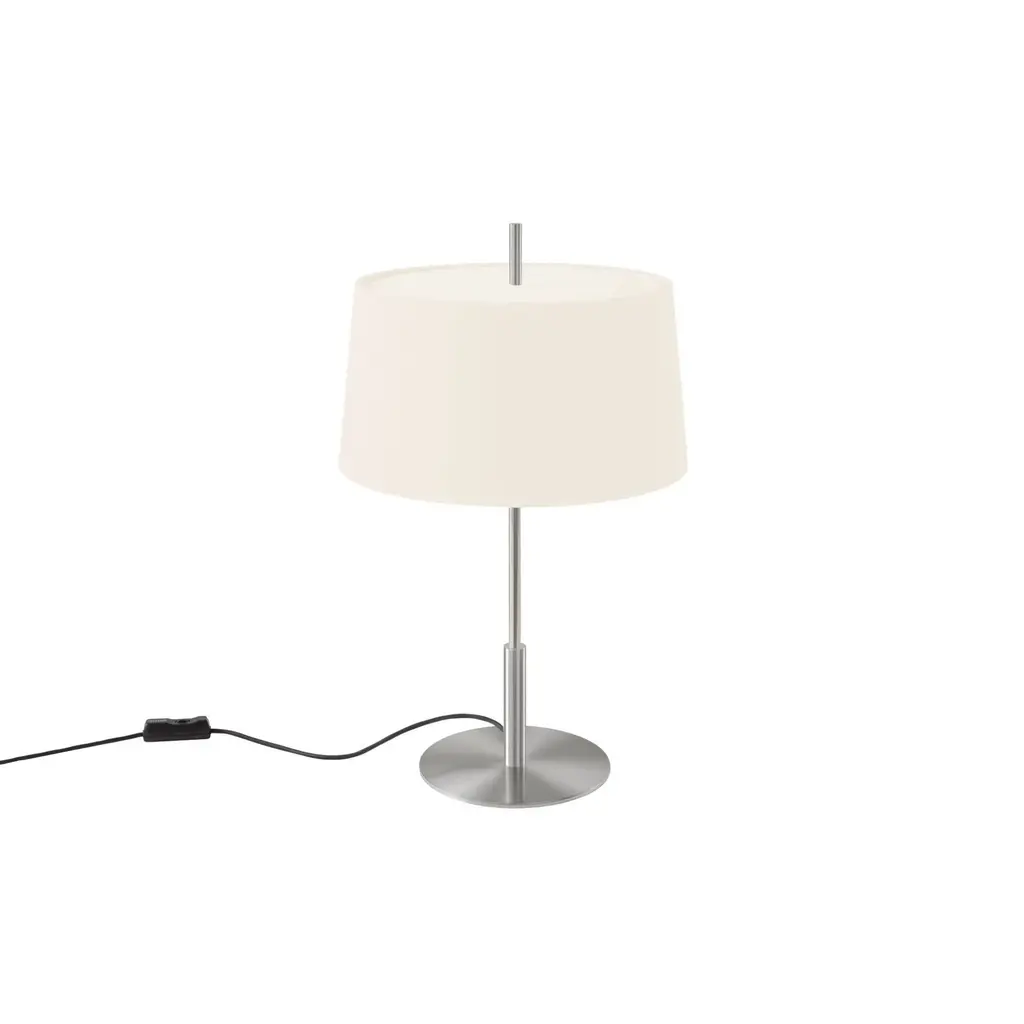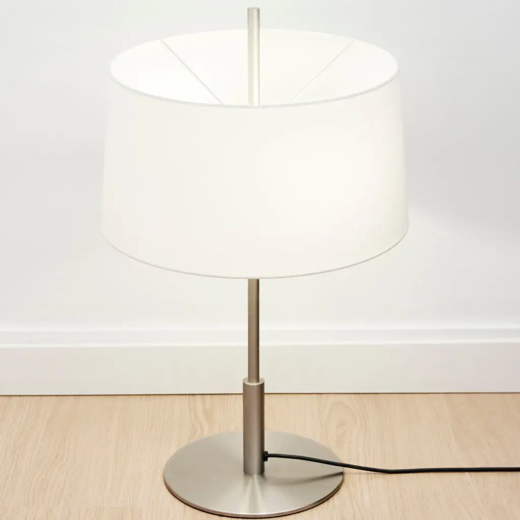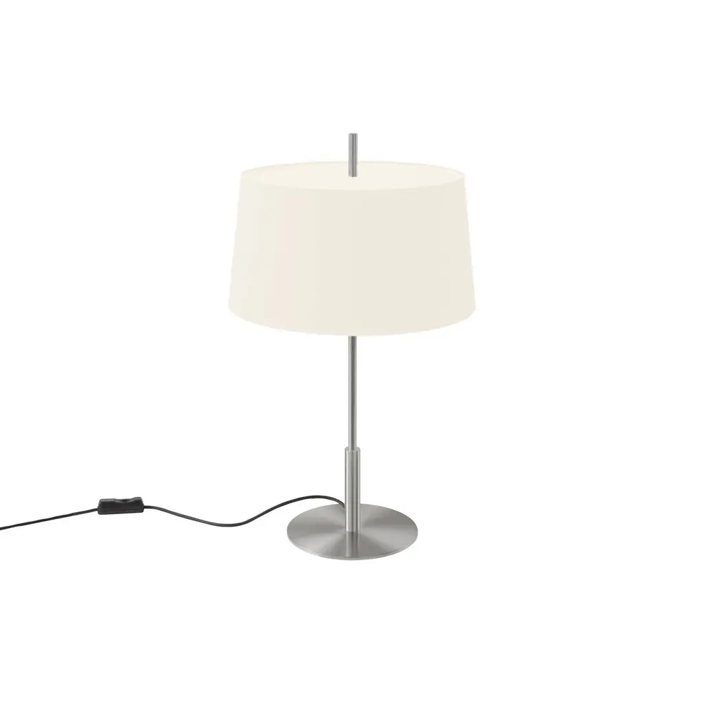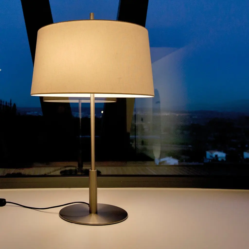 Diana's gleaming structure and crisp linen shade adapt as a harmonious table lamp, a variation on the original made for Barcelona mayor's office in the run-up to the 1992 Olympics. Melding timeless elegance and clean modernity, Federico Correa and brothers Alfonso and Miguel Milá conceived the double-bulb design that provides a warm glow without creating shadows. Updated with LED technology, Diana offers shade choices that include an additional upper diffuser for energy-saving bulbs.