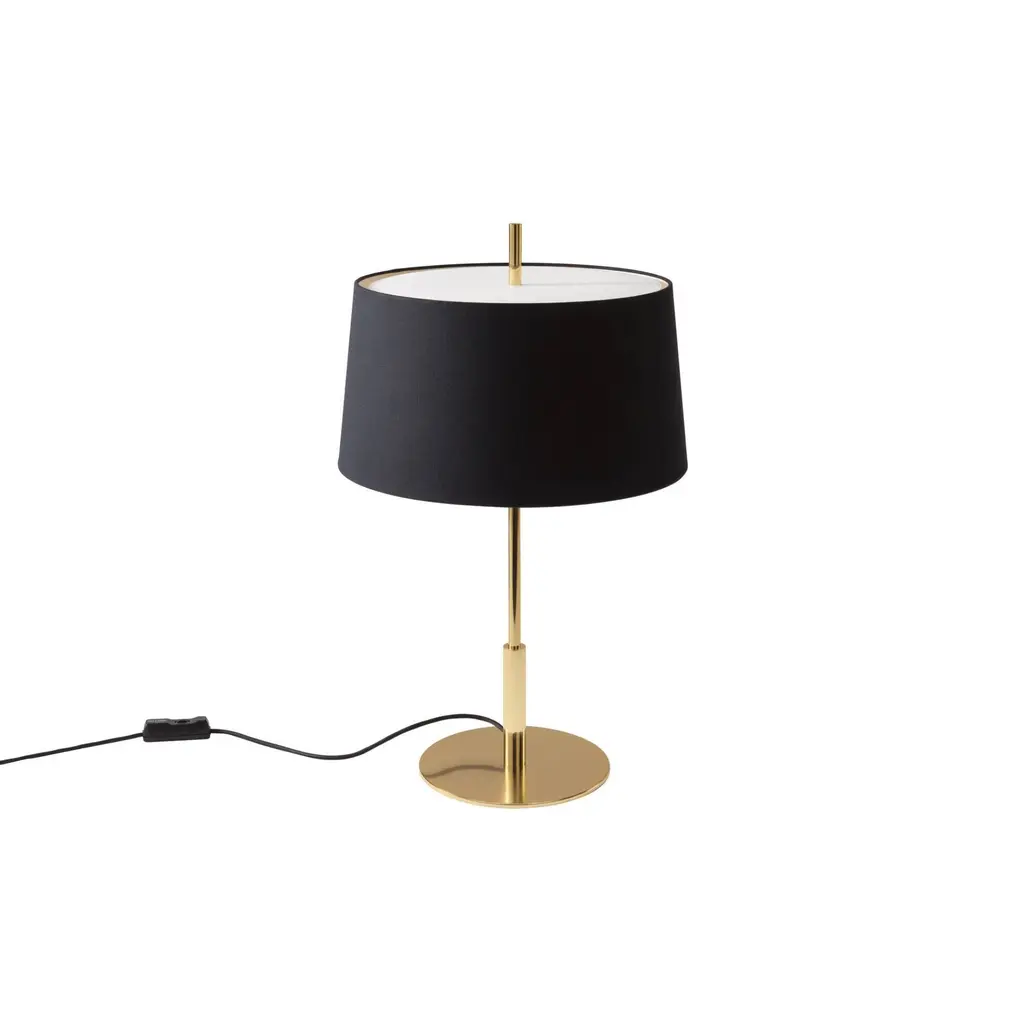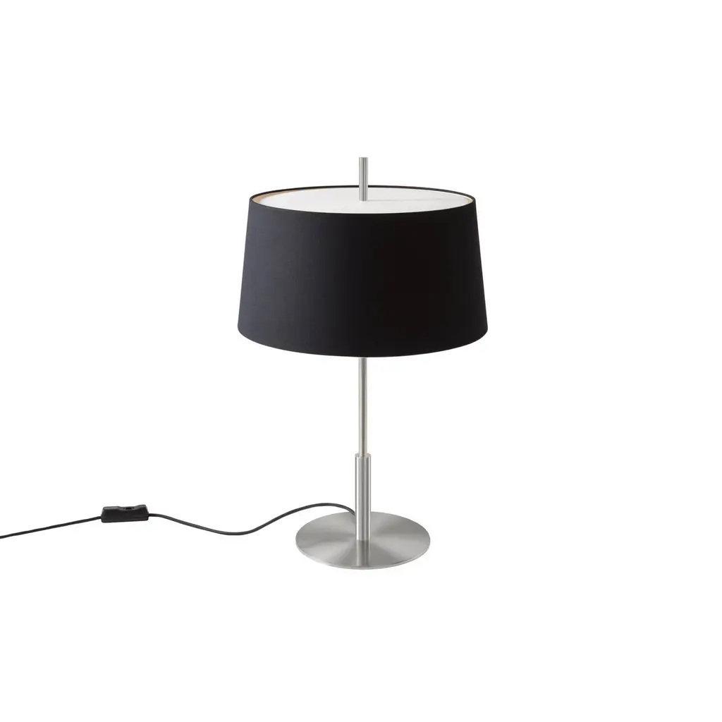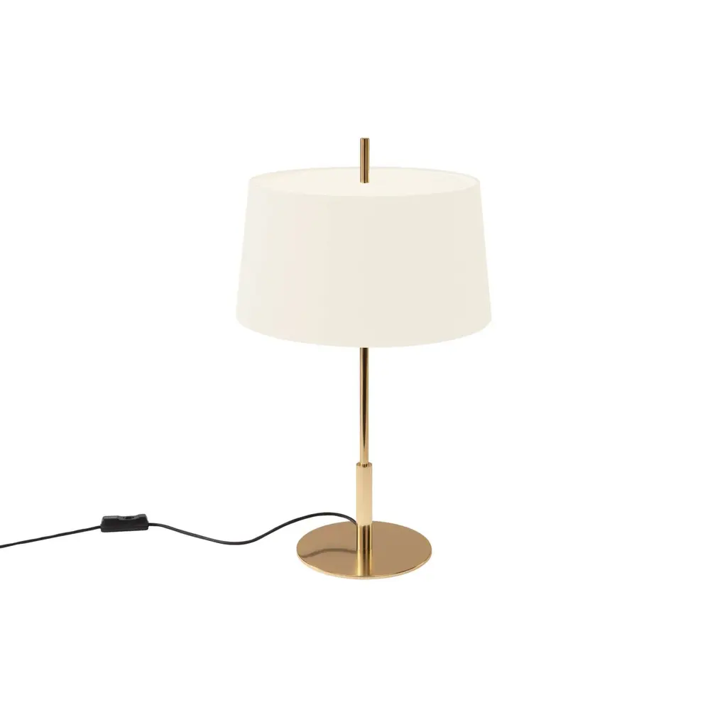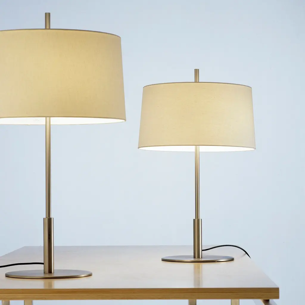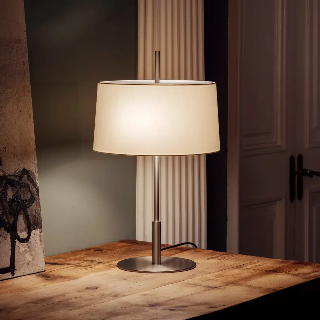 Diana's gleaming structure and crisp linen shade adapt as a harmonious table lamp, a variation on the original made for Barcelona mayor's office in the run-up to the 1992 Olympics. Melding timeless elegance and clean modernity, Federico Correa and brothers Alfonso and Miguel Milá conceived the double-bulb design that provides a warm glow without creating shadows. Updated with LED technology, Diana offers shade choices that include an additional upper diffuser for energy-saving bulbs.
