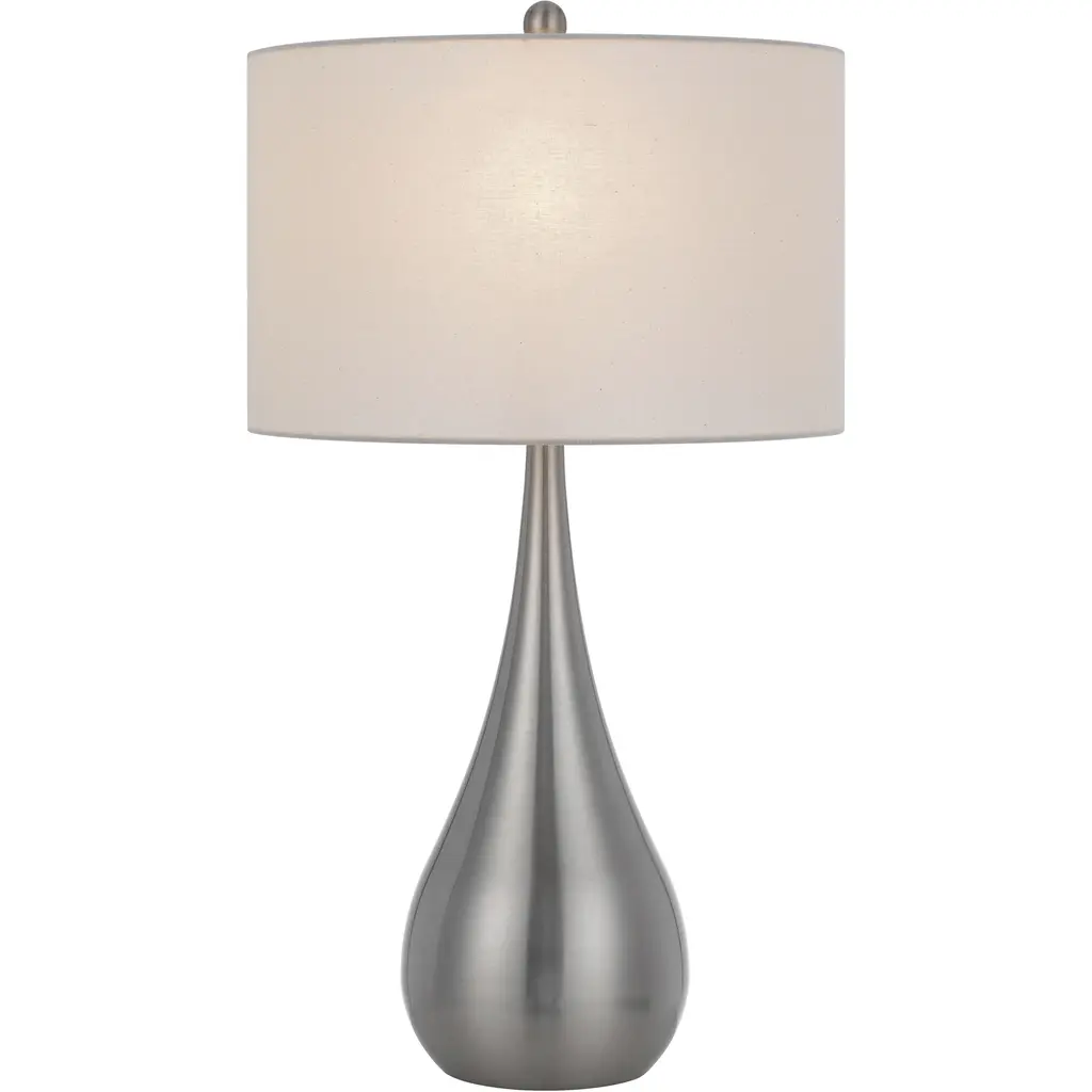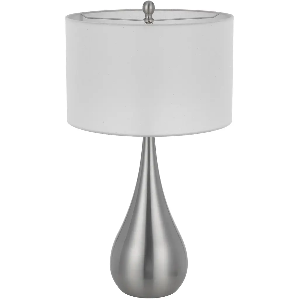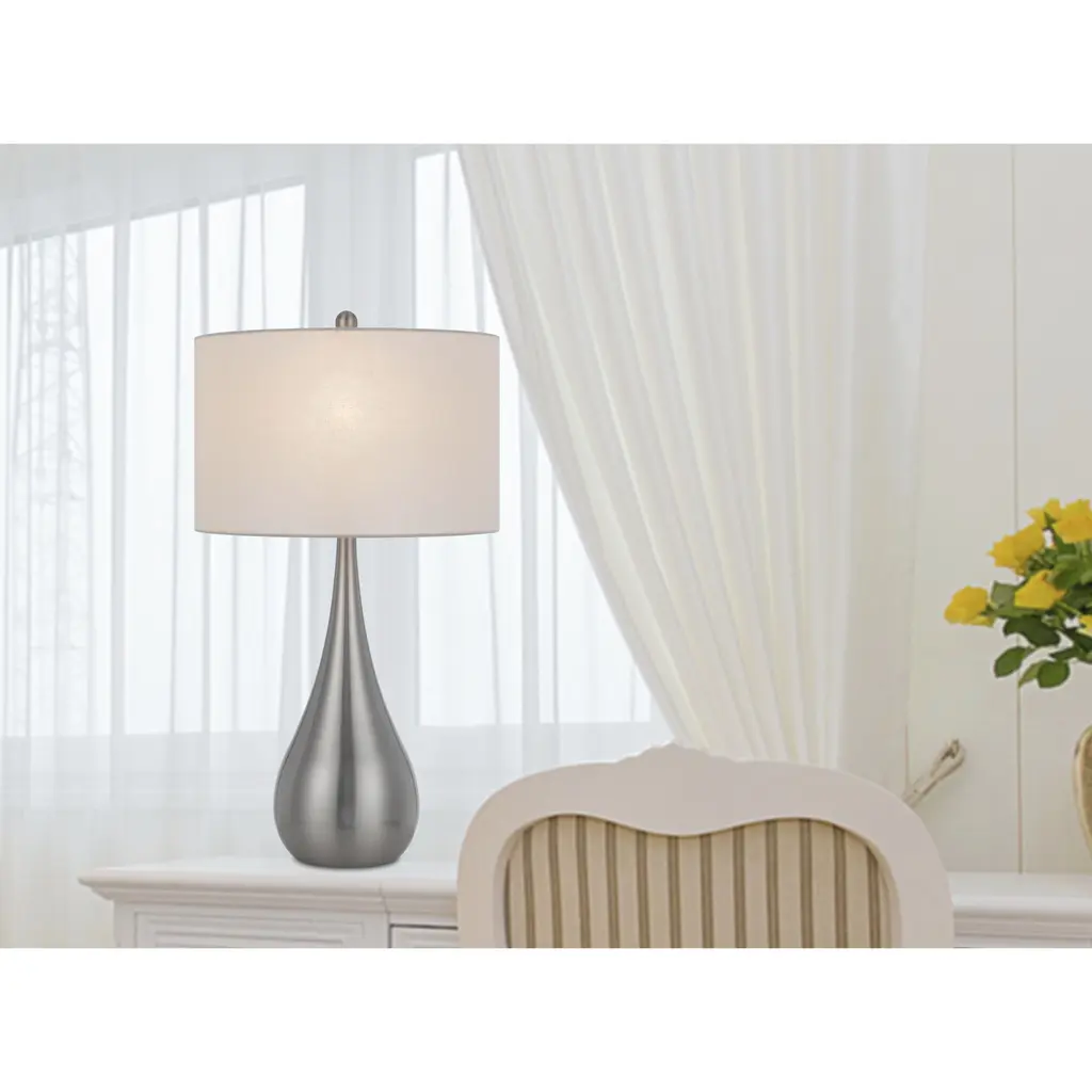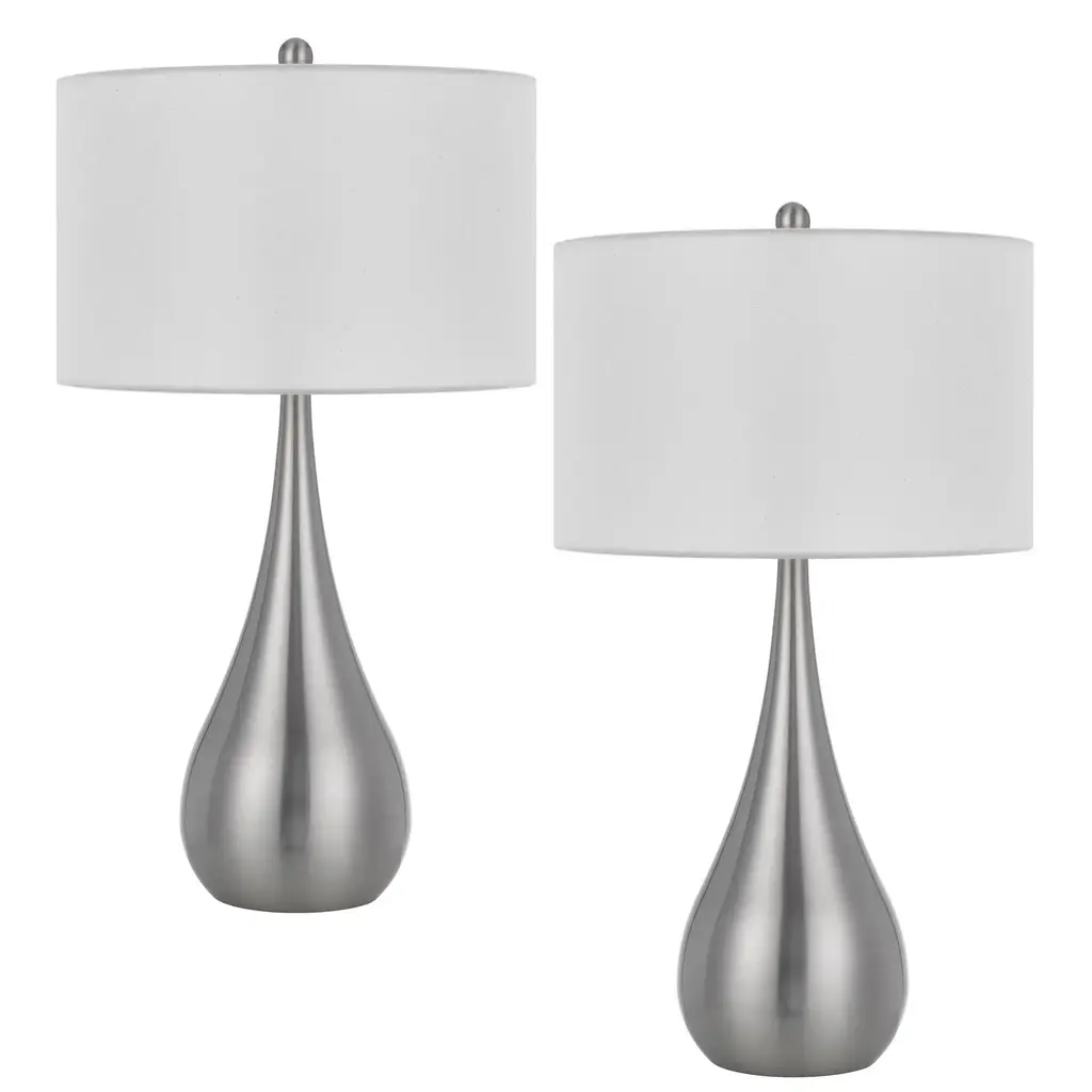 Add a coordinated look to your room with this matching set of metal table lamps. They feature a solid tear drop design The lamps ship together with matching white fabric shades and finials.