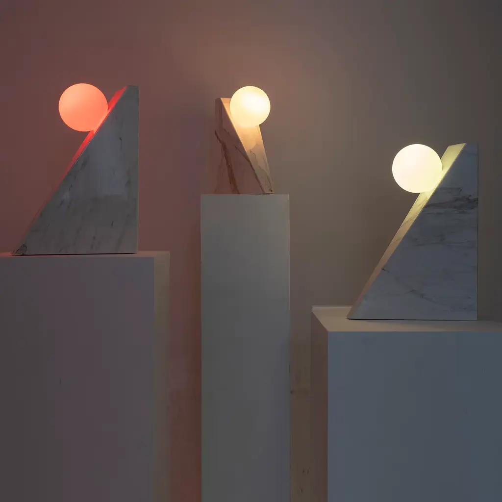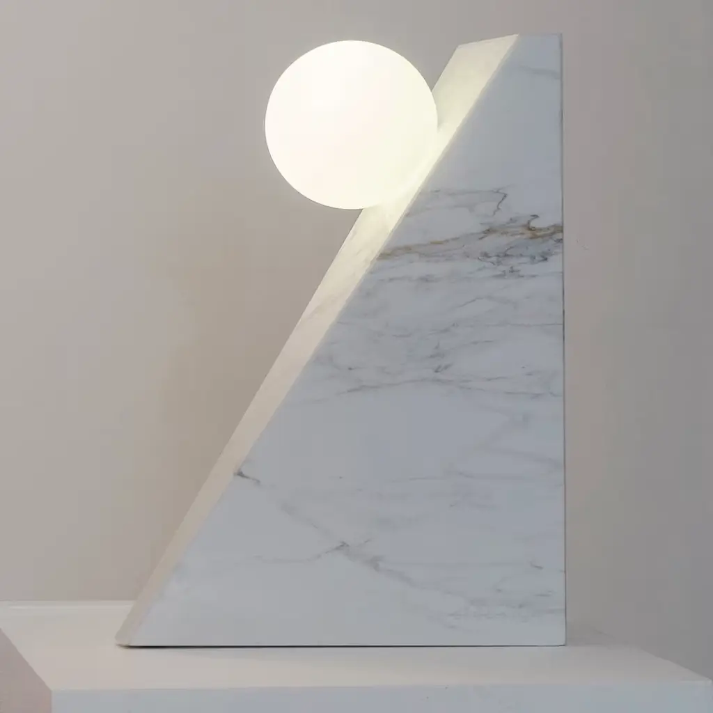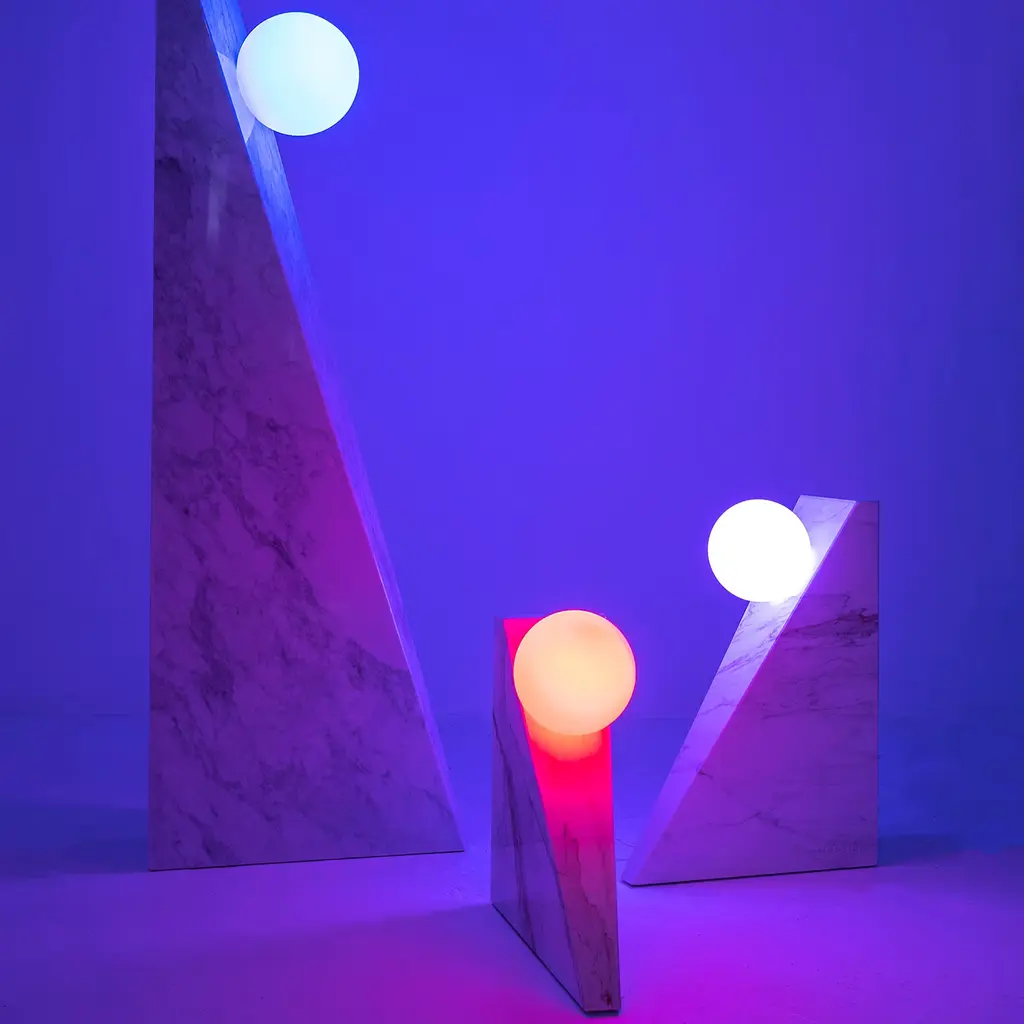This eye-catching table lamp designed by Sid&Sign Studio flaunts a sculpted silhouette of clear geometric inspiration. Crafted of prized Calacatta Oro marble, the piece features a sleek scalene shape with a spherical glass diffuser seemingly floating in mid-air. The diffuser houses a chromo-therapeutic light source, whose shade can be changed thanks to the remote control (included). Customization available upon request to the Concierge.