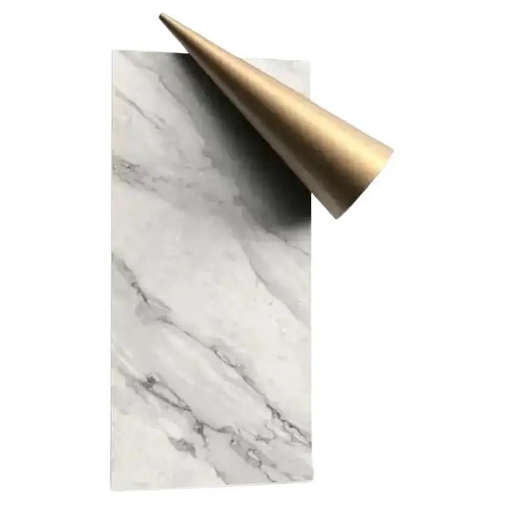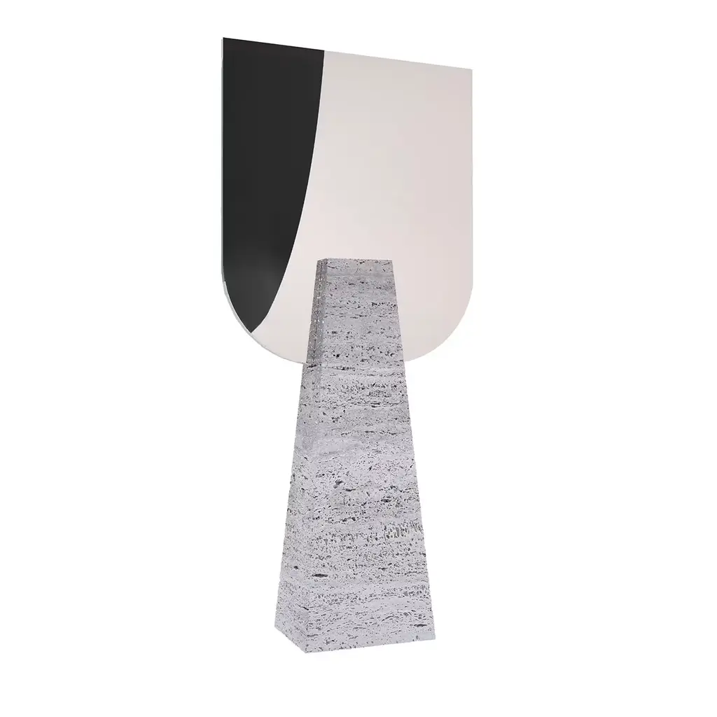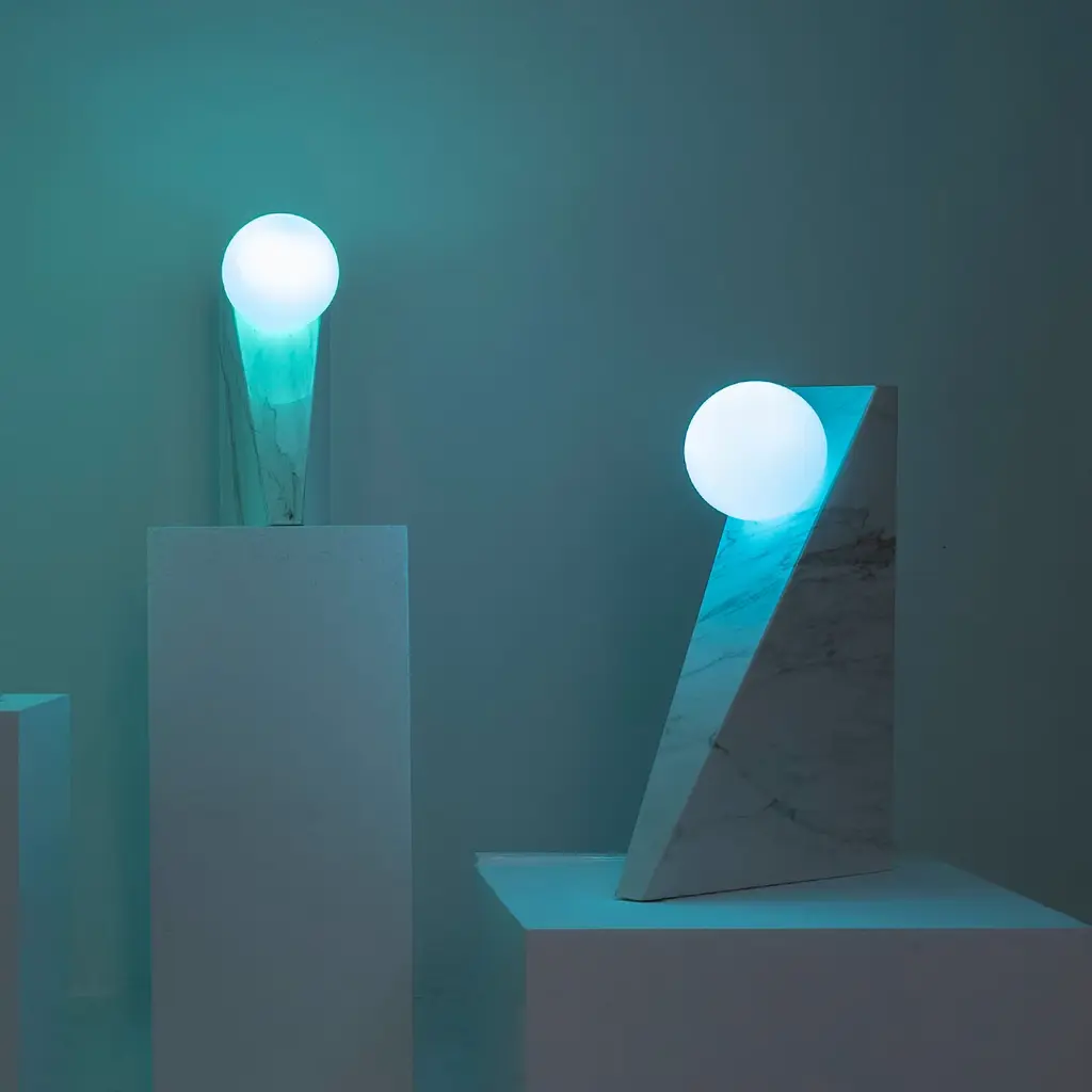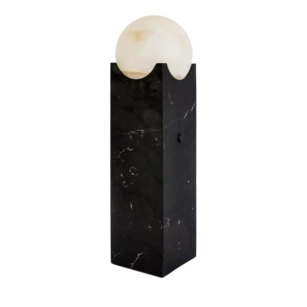 This eye-catching table lamp designed by Sid&Sign Studio flaunts a sculpted silhouette of clear geometric inspiration. Crafted of prized Calacatta Oro marble, the piece features a sleek scalene shape with a spherical glass diffuser seemingly floating in mid-air. The diffuser houses a chromo-therapeutic light source, whose shade can be changed thanks to the remote control (included). Customization available upon request to the Concierge.